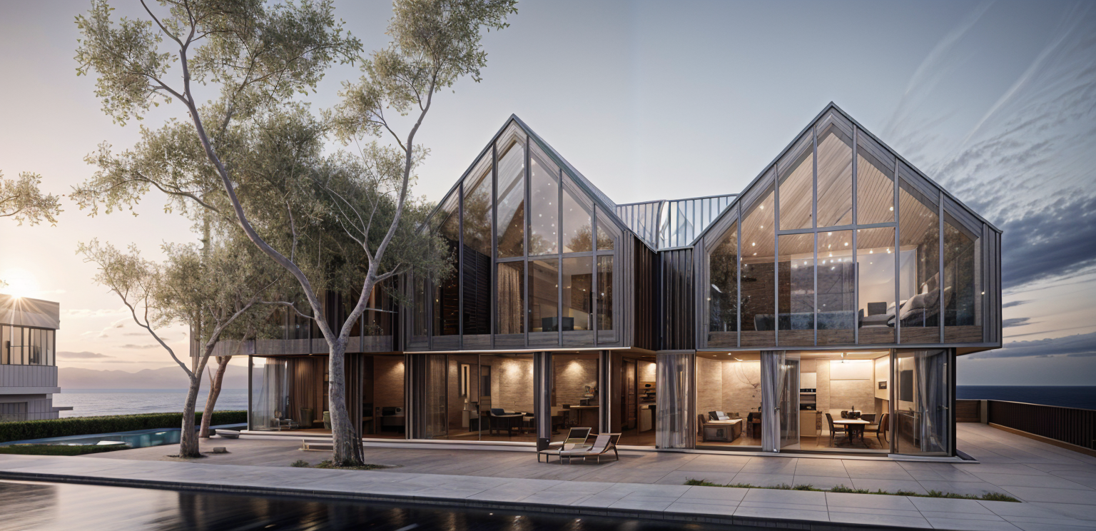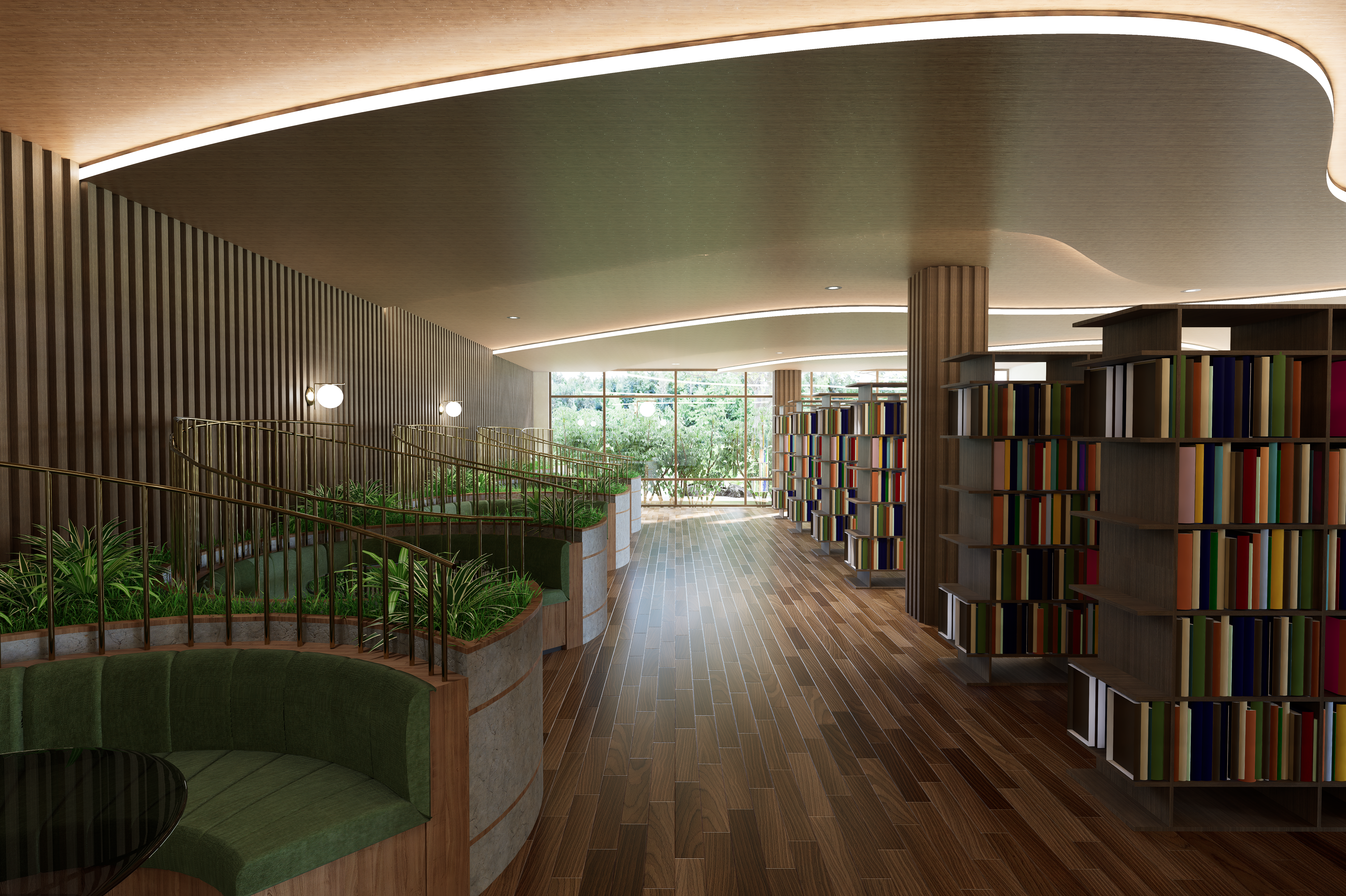 i want to preserve the style for this rendering but make it very realistic and update the books preserve the wall panel in the left and the layered ceiling in wood the banquette seating is green velvet architecture