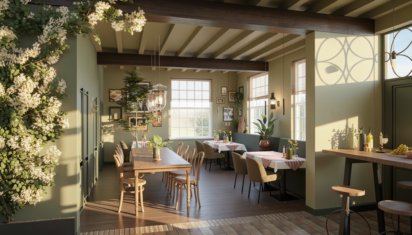 use the uploaded sketchup model as the absolute architectural reference strict preservation mode do not modify architecture geometry layout or camera do not move furniture or umbrellas do not change the building design enhance realism only lighting barcelona mediterranean daylight soft warm sunlight entering the courtyard natural shadows from trees and umbrellas people add a calm library courtyard atmosphere 5 7 people maximum people reading books someone using a laptop two people quietly talking someone walking through the courtyard people should feel relaxed and natural realism photorealistic architectural visualization natural materials soft global illumination realistic glass reflections detailed grass and soft ambient shadows