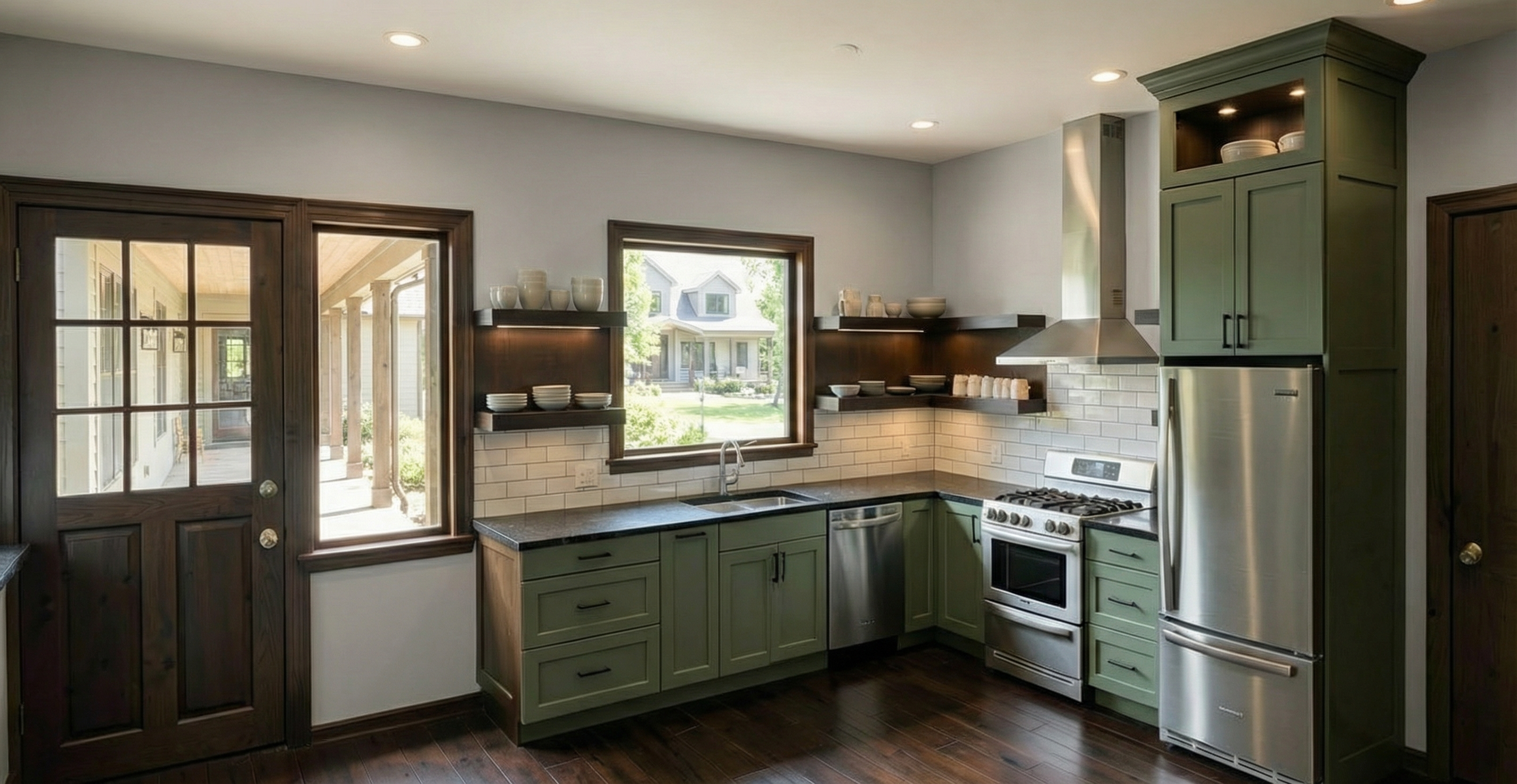 cabinetry is a sage green paint stove is a white summit brand gas refrigerator is fisher paykel 13 5 cu ft series 5 hood and dishwasher are stainless steel flooring is a light rustic white oak