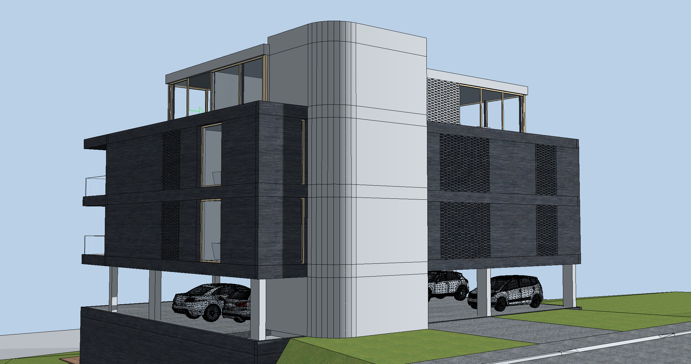 modern house in city houses around dark grey bricks light wood grass and trees around