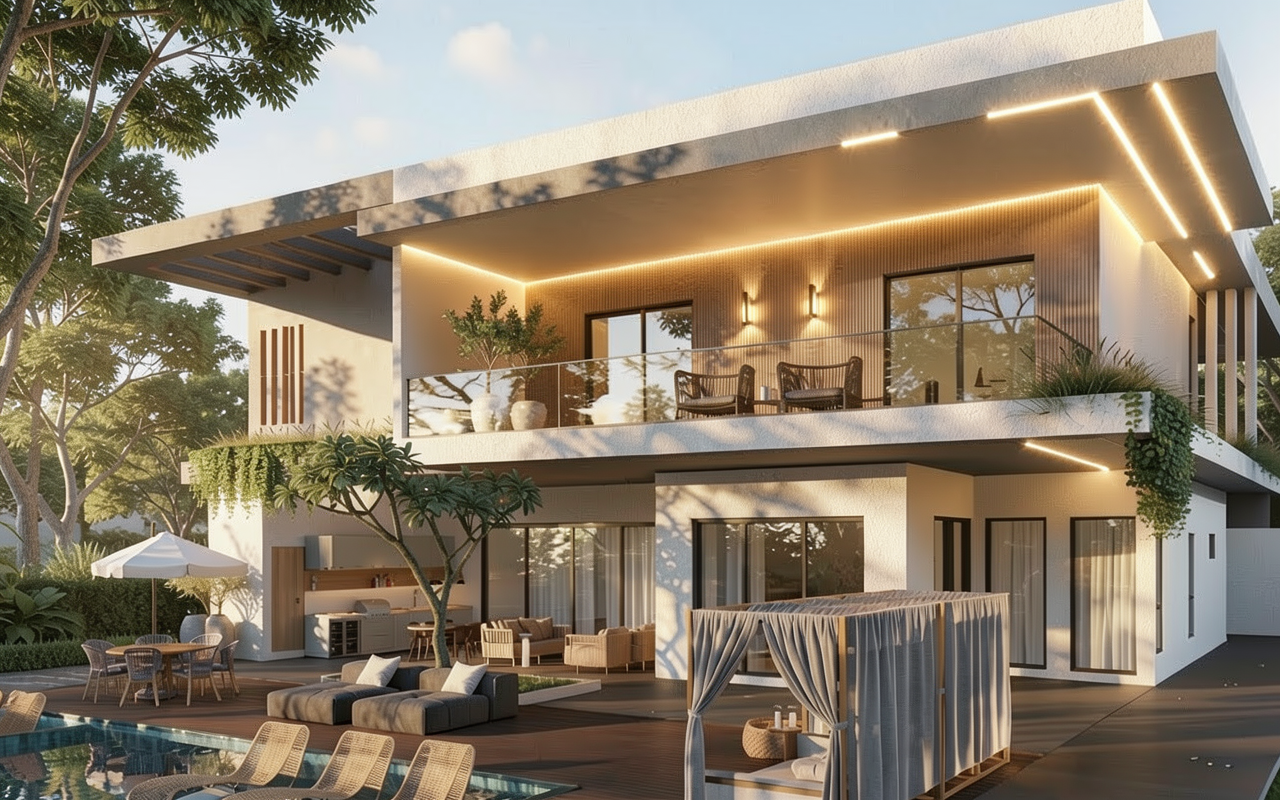concrete tile roof south florida landscape afternoon lighting large format tile on verical columns stucco field wood front door and garage door