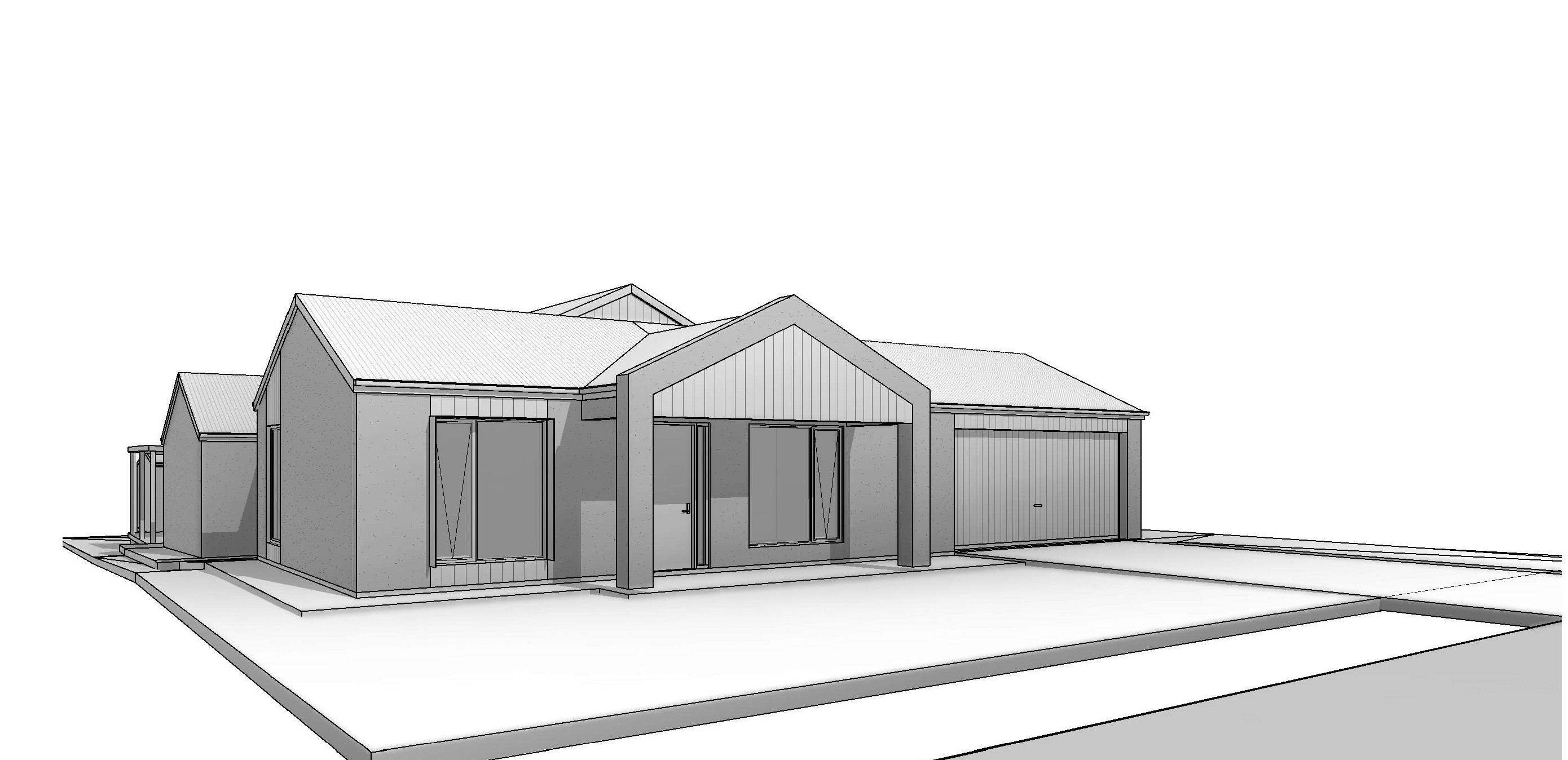 the vertical panel cladding is a light shade sage green window frames are colorbond southerly in colour remaining cladding is a half strength of colorbond dune the roof decking and gutters are corrugated in colorbond shale grey the front landscaping is lawn charcoal grey concrete pavements arond house and to driveway