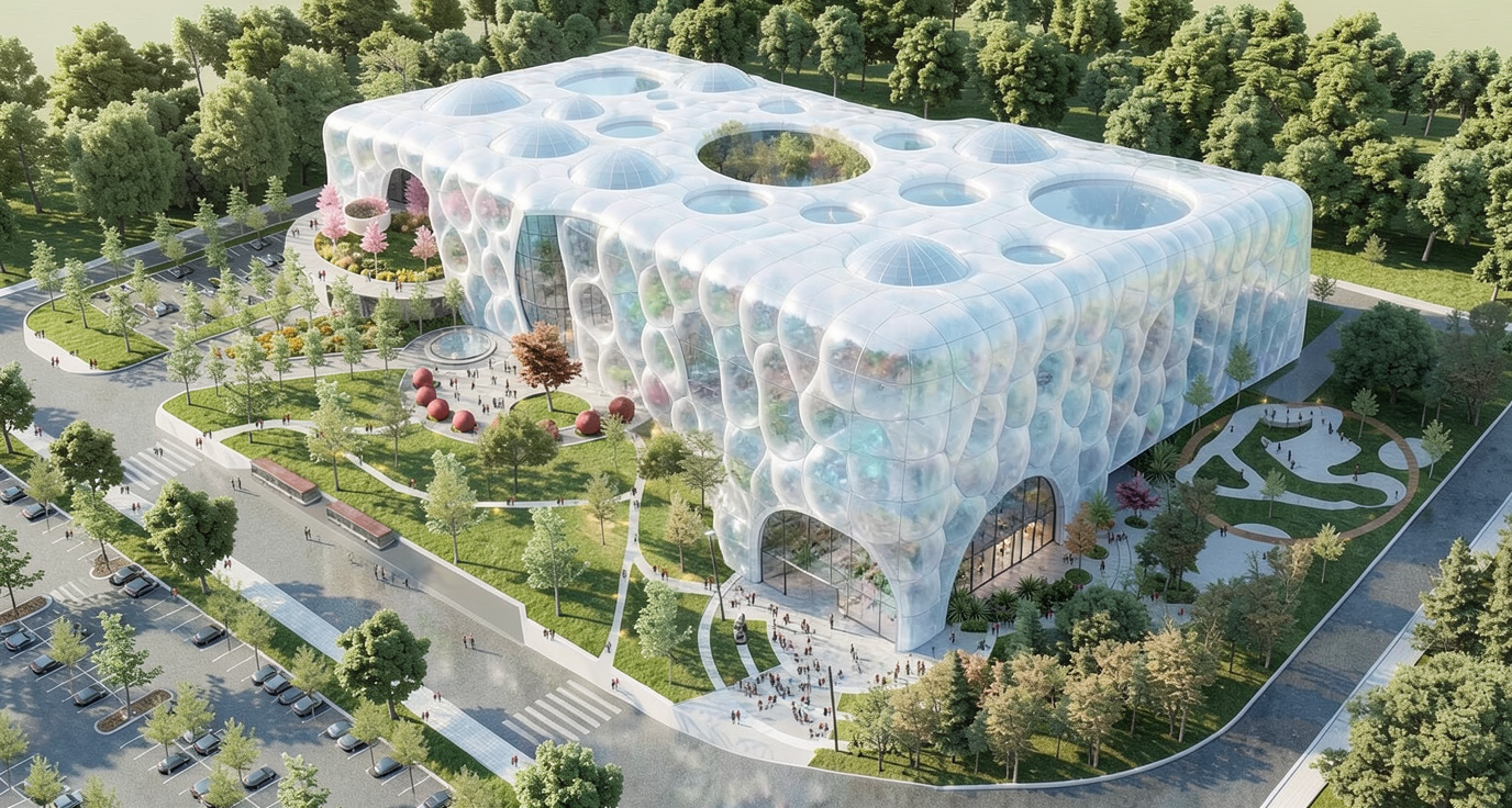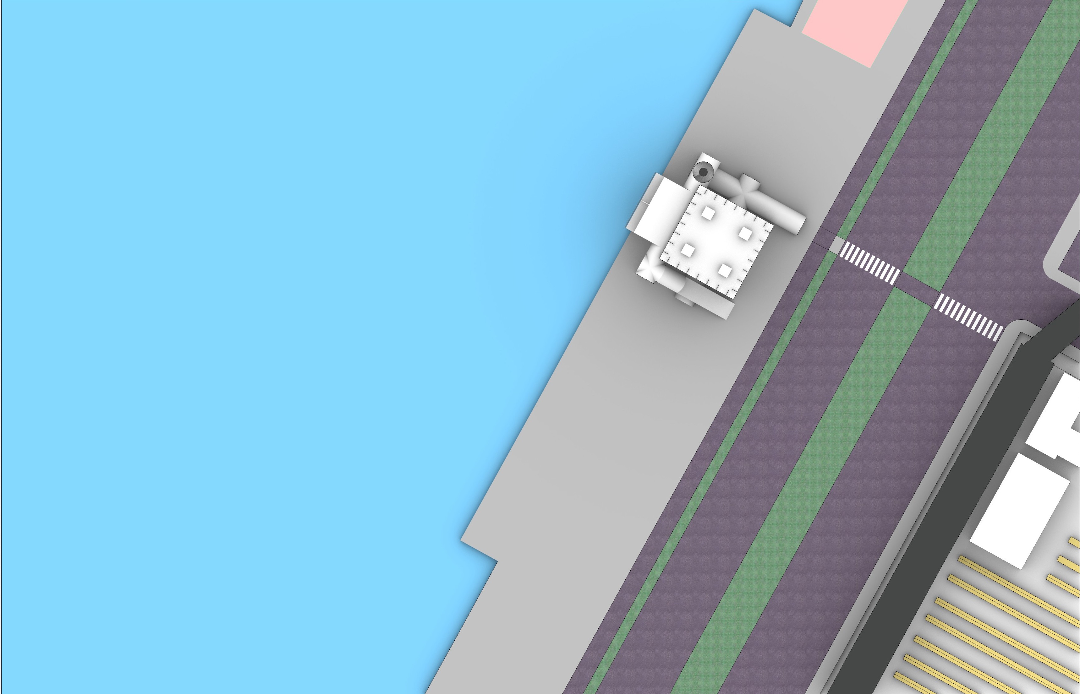 do not change any existing geometry create an architectural plan drawing of the site around my building the blue color that is on the left hand side of the image is meant to be water in the form a river the building is the white square with the white rectangles around it do not change the building in any way the pink shape in the top right corner needs to be four existing pickleball courts that run the length of the rectangle do not put the pickleball courts anywhere but the pink shape place a small parking lot in between the pink shape and the white building add any landscaping to make the parking lot look appealing the purple material is meant to be the asphalt of the existing street do not change the shape of the existing street the green areas are medians in between the road where there needs to be some trees and other plants the remaining central gray portion needs to be turned into a cool park with an outdoor classroom