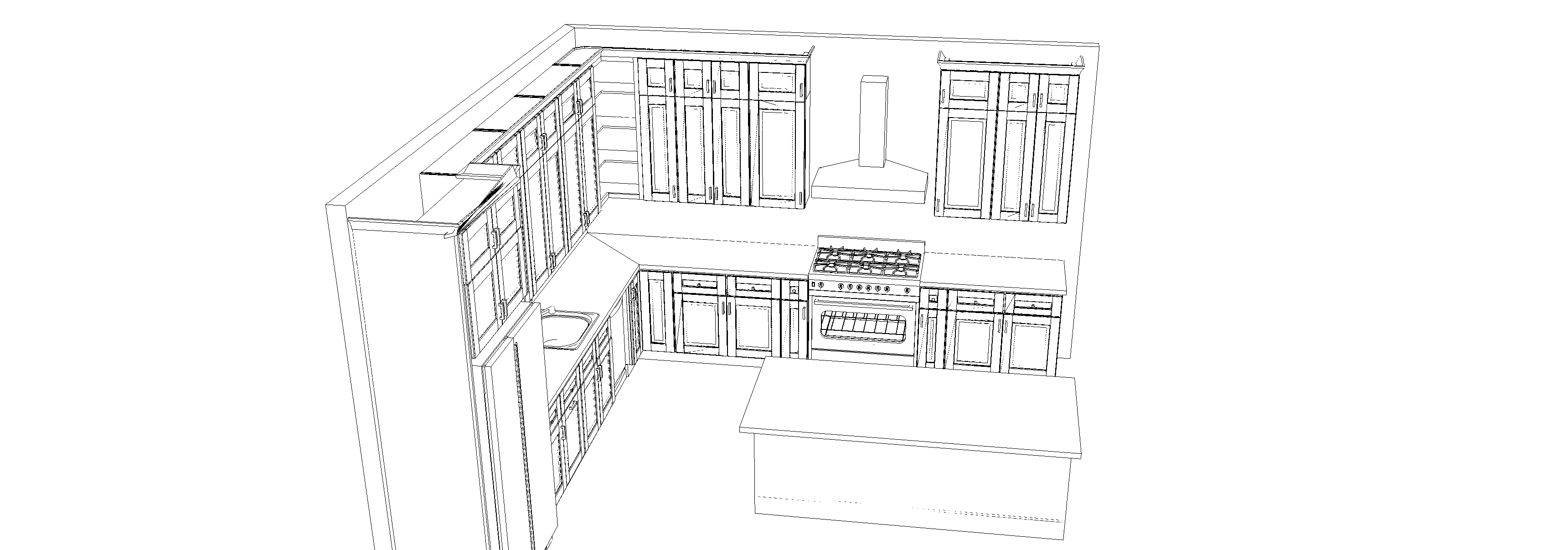 apply the following finishes to the kitchen shown in the line drawing main cabinetry in b8 butterscotch warm honey toned woodgrain with a subtle satin sheen island cabinetry in e3 sage soft green matte finish countertops in white marble with light grey veining for both perimeter and island brushed nickel hardware light natural hardwood flooring with visible grain stainless steel appliances and white walls keep details and geometry identical