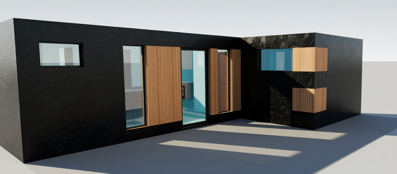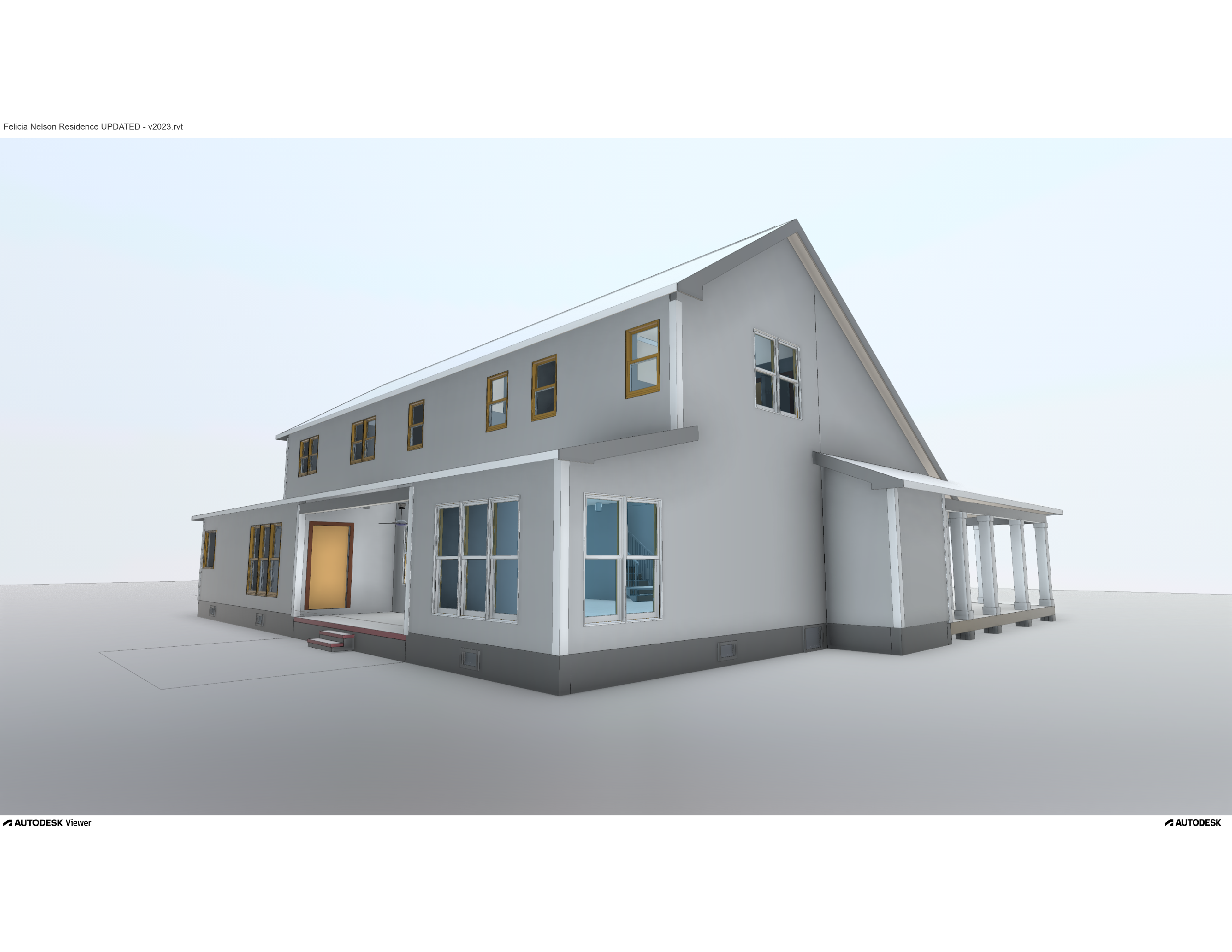 create a realistic cozy suburban house scene with a two story house featuring a light gray exterior with crisp white trim the front door is light red adding an inviting touch all windows are framed with white panels and the garage doors are a soft white with a subtle grid pattern at the windows the roof is a gentle slate gray contrasting harmoniously with the rest of the fa ade surround the house with a tranquil lush green lawn under a crisp clear blue sky casting soft natural shadows to enhance the serene atmosphere add trees in the background and remove garage doors and driveway