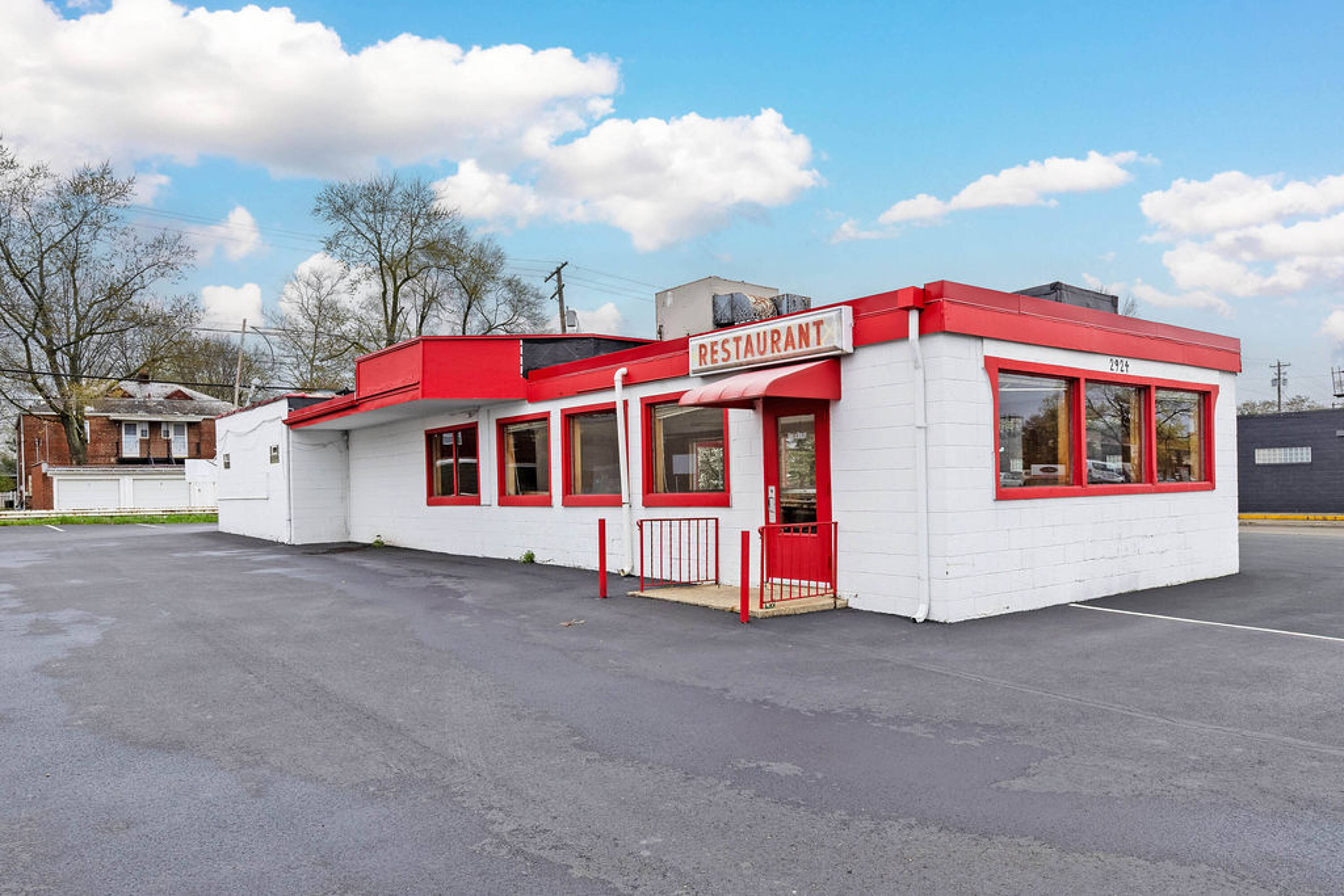 make the brick downspouts and roof trim all black and all the window trim doors bollards and railing painted with black change the signage to read jazz and eggs in a neon script