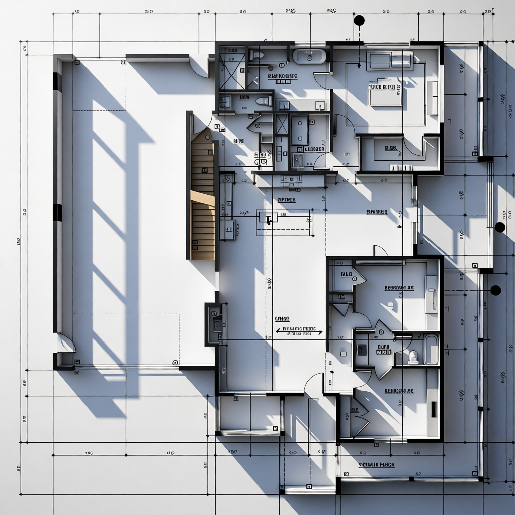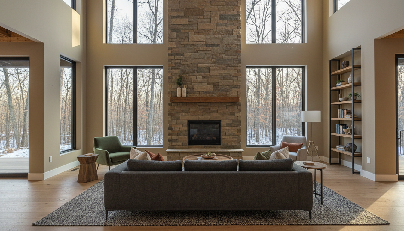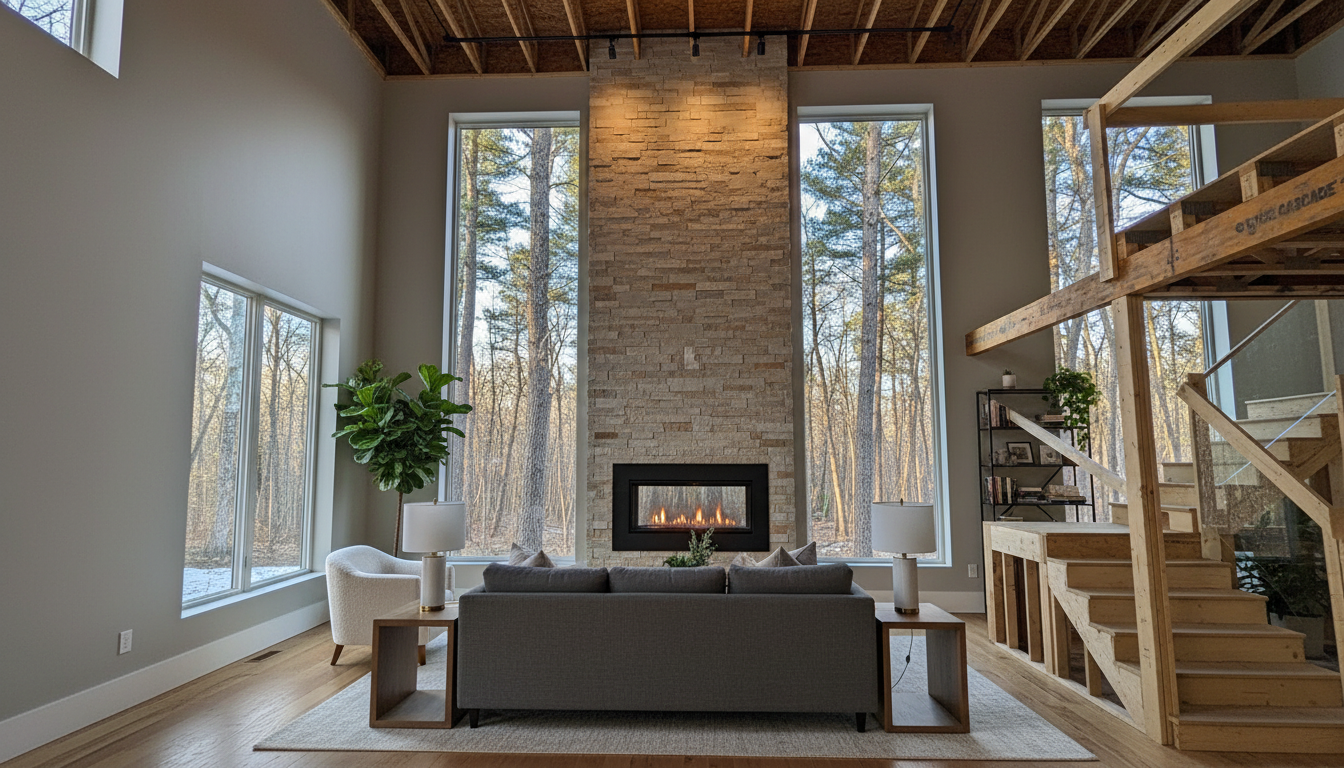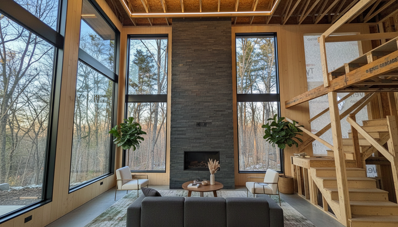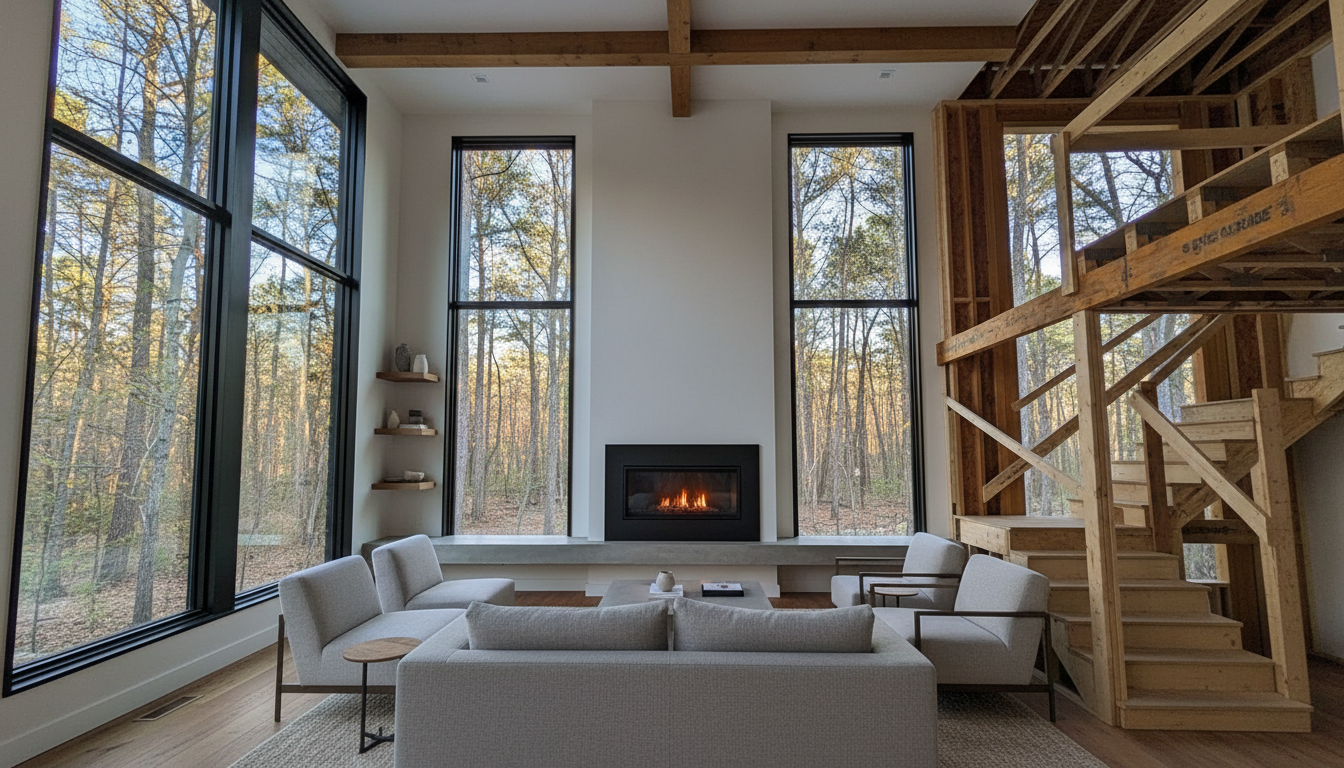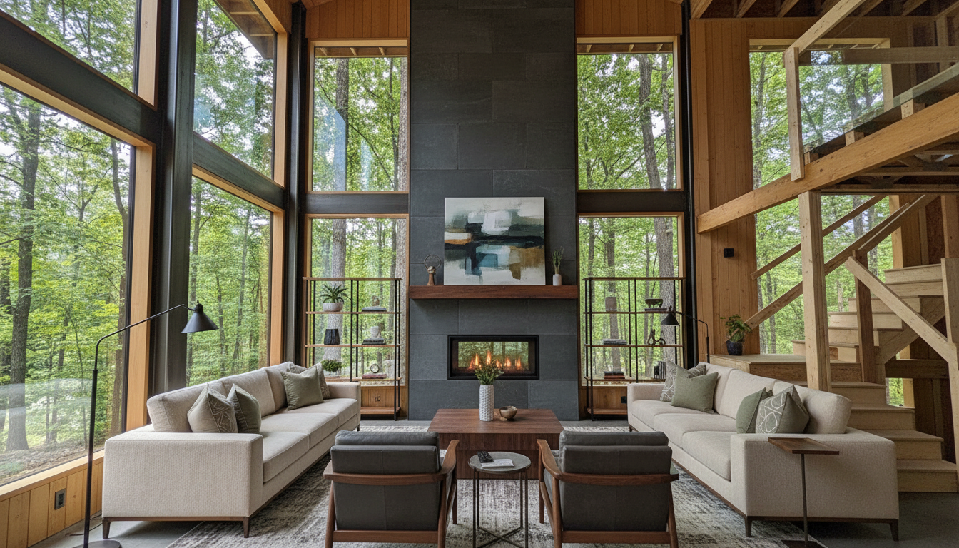 a modern rustic house with log posts and accent beams retain the exact structure window arrangement deck columns rooflines foundation height trusses and proportions exactly as shown in the reference image add a gravel driveway extending toward the house and integrated naturally into the terrain surround the property with a lush dense forest of tall mixed evergreens and hardwoods sun is shining across the front of the home and grass create ultra realistic lighting crisp shadows detailed textures in the siding and glass reflections and a partly cloudy sky with light atmospheric depth render in hyper realistic architectural visualization quality 8k resolution it is the fall season add a metal roof