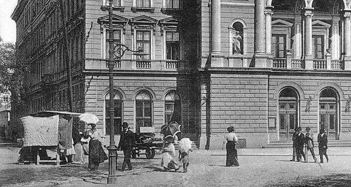 slow camera rotating to right people walking and talking in 1900 s style dressing