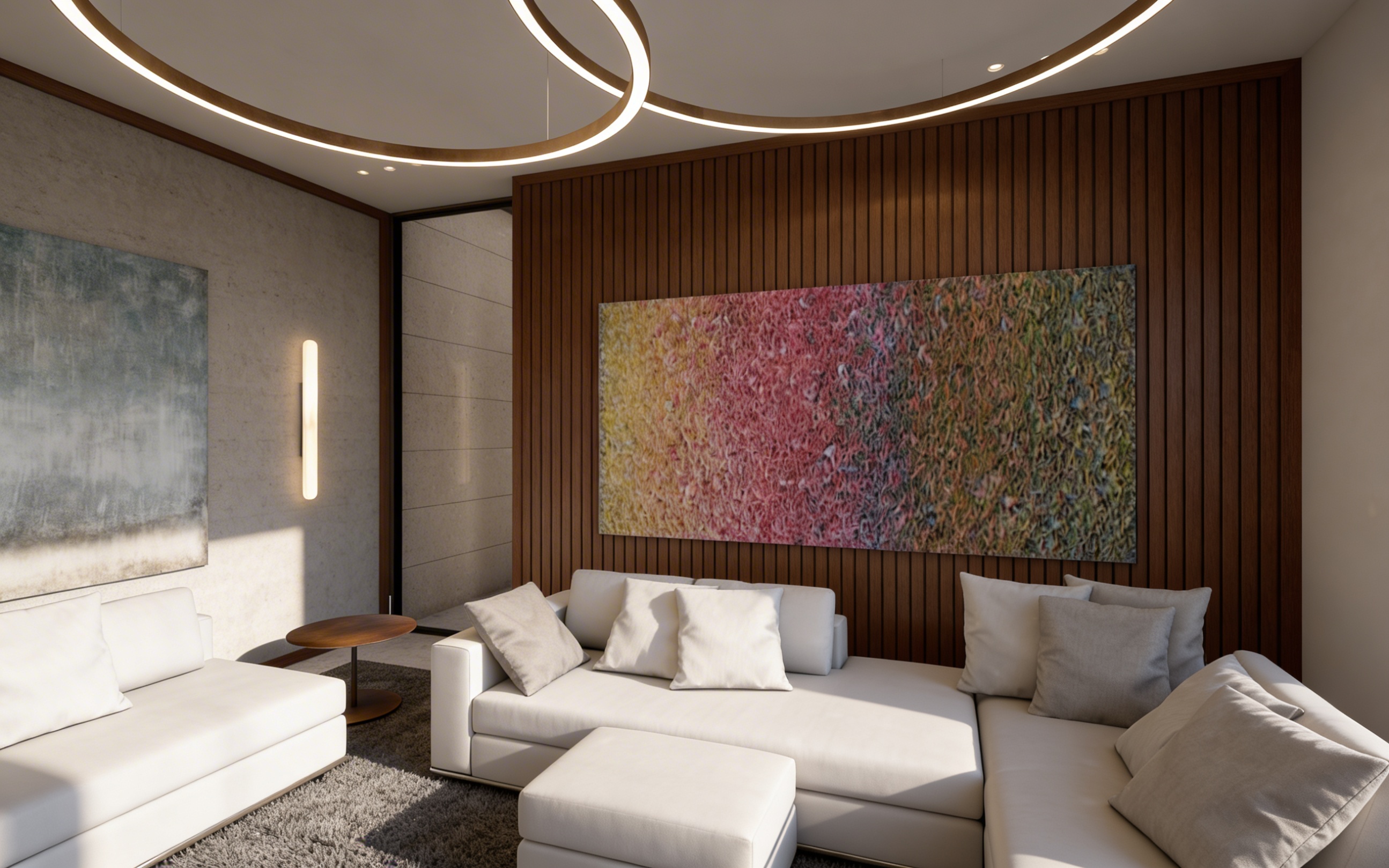 keep exactly the same geometry make materials more realistic make lighting more realistic all walls and ceiling have beige texture add lighting to the lights of the ceiling the bottom wall of the space is covered all with mirror add a man running on the treadmill with direction to the mirror add lighting coming from the lighting wall fixtures behind the treandmill