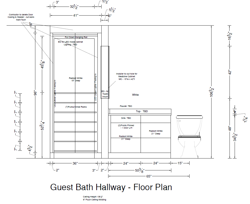 floor plan for a guest bath hallway details a combination of storage and vanity units here are the key specifications from the drawing dimensions layout total width the main built in area spans 65 including a 36 wide storage cabinet and a 24 wide vanity total height the ceiling height is marked at 106 with a 6 flush ceiling molding toilet clearance there is a 15 space allocated from the edge of the vanity to the center of the toilet storage cabinet left features includes a pull down hanging rail at the top and 7 pullout shoe racks at the bottom lighting specified for led linear lights facing inward and an electrical outlet eo for a future led inside cabinet light depth the unit is 19 deep in radiant white vanity sink area right vanity a 24 wide unit 21 deep also in radiant white it features two pinned fronts and one left hand l h door countertop the top and sink are noted as tbd to be determined with a standard height of 34 to the top of the vanity base medicine cabinet above the vanity is a space for a 15 w x 42 h recessed medicine cabinet an outlet eo is provided nearby for an electric toothbrush