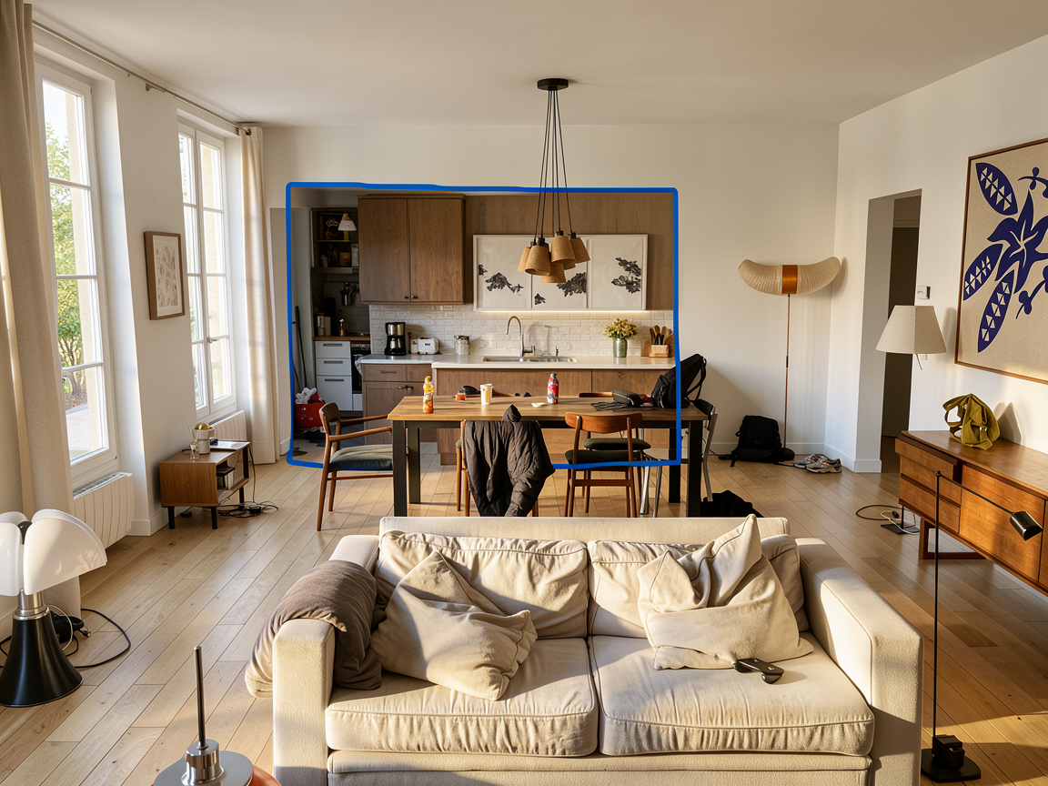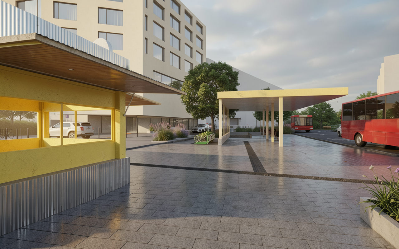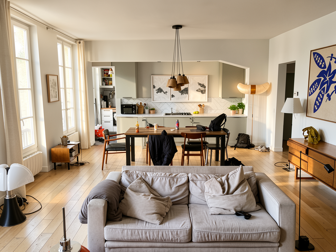 create a hyper realistic rendering with soft morning light through the doors interior shot of modern bedroom with doors opening up to yard with seating area and greenery the flat is in athens greece modern abstract artwork above bed colourful throw on bed modern linear pendants above nightstands hidden led lights on the ceiling all lights off tone should be relaxing and inviting