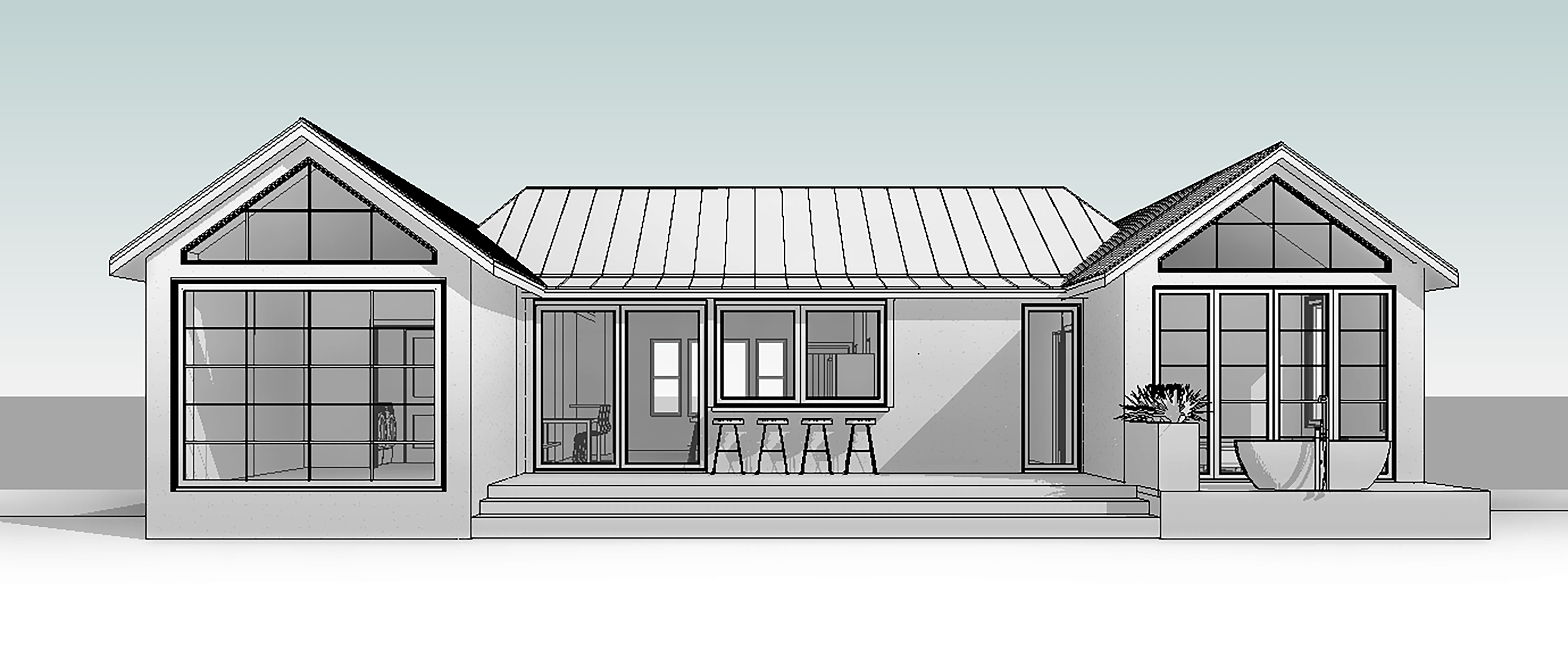exterior shot picture on the right is the existing property surrounding in the same view as the image that is being proposed image on the left is inspiration for the architecture of the proposed structure would like a golden hour render the stone on the left massing should be siding the stone on the right madding should be deck to match the middle deck finish
