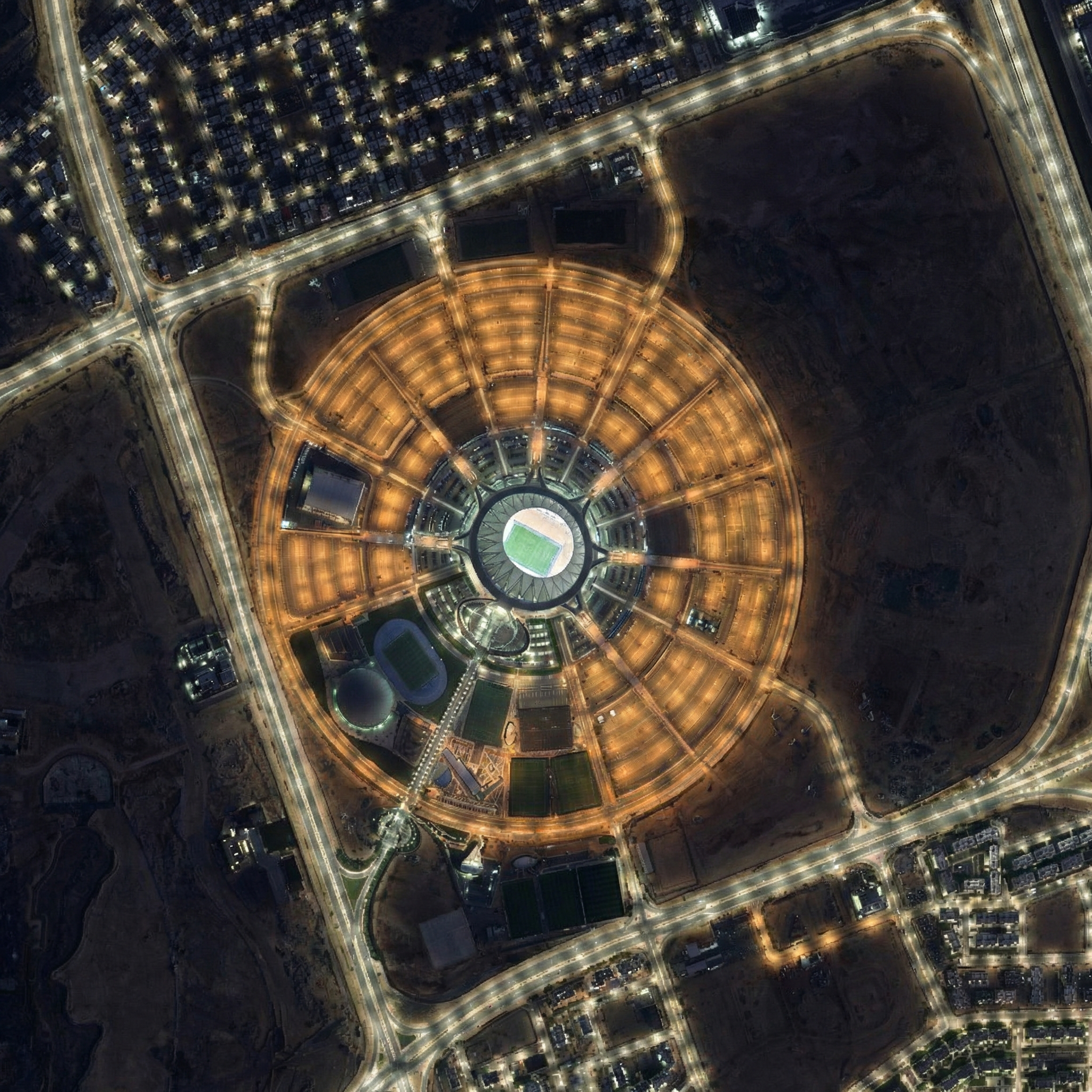 convert this real world satellite daytime map into a realistic nighttime satellite image preserve exact geographic accuracy no change to building shapes footprints roads parking layout or scale no added or removed structures no redesign or artistic reinterpretation introduce realistic urban night lighting variation parking areas lit with warm sodium or amber toned lighting major roads lit with neutral white lighting stadium and large public venue lighting slightly cooler white service roads and back areas dimmer and uneven vegetation and unlit areas remain very dark lighting characteristics soft overlapping light pools smooth gradients no sharp circles realistic brightness differences between zones subtle contrast not cinematic exaggeration top down satellite perspective only technical constraints no bloom no lens flare no haze no fog no strong shadows even exposure suitable for emissive light masking the result should resemble a real nighttime top down drone photo with varied urban lighting temperature and contrast