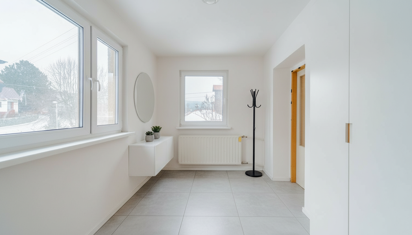 this is an interior view of a coffee shop we are looking out the window of the storefront and we see a vacant lot with a fe 5 story buildings surrounding it this view out the windows is blurred the space has very soft natural light in it do not change anything or add anything to the structure of this image do not add any new items to the shelving show only what is there already show light coming from the ceiling light fixtures do not put any new objects in the rendering and do not remove any objects the low stools are yves klein blue and the table bases are lime green powder coated metal