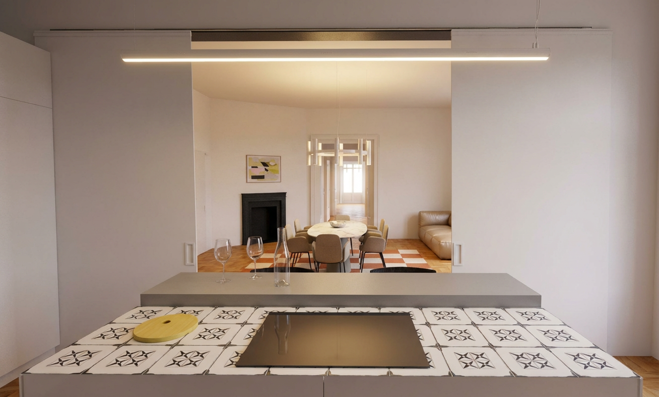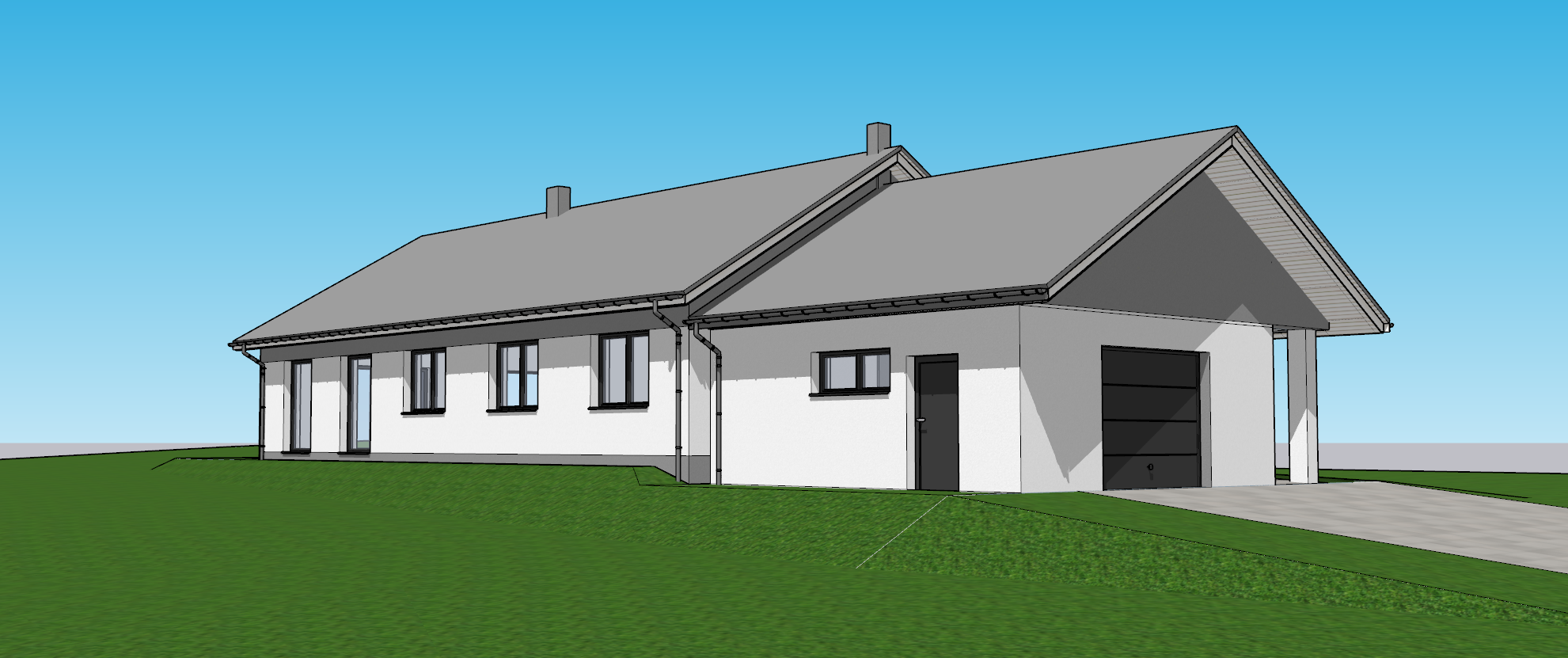 a roof made of flat gray tiles laid in a staggered pattern white and gray plaster on the walls anthracite colored window and door joinery a chimney covered with gray seam sheet metal low bushes around the house sunny sky white wood soffit lamps in the soffit curtains on the windows children playing