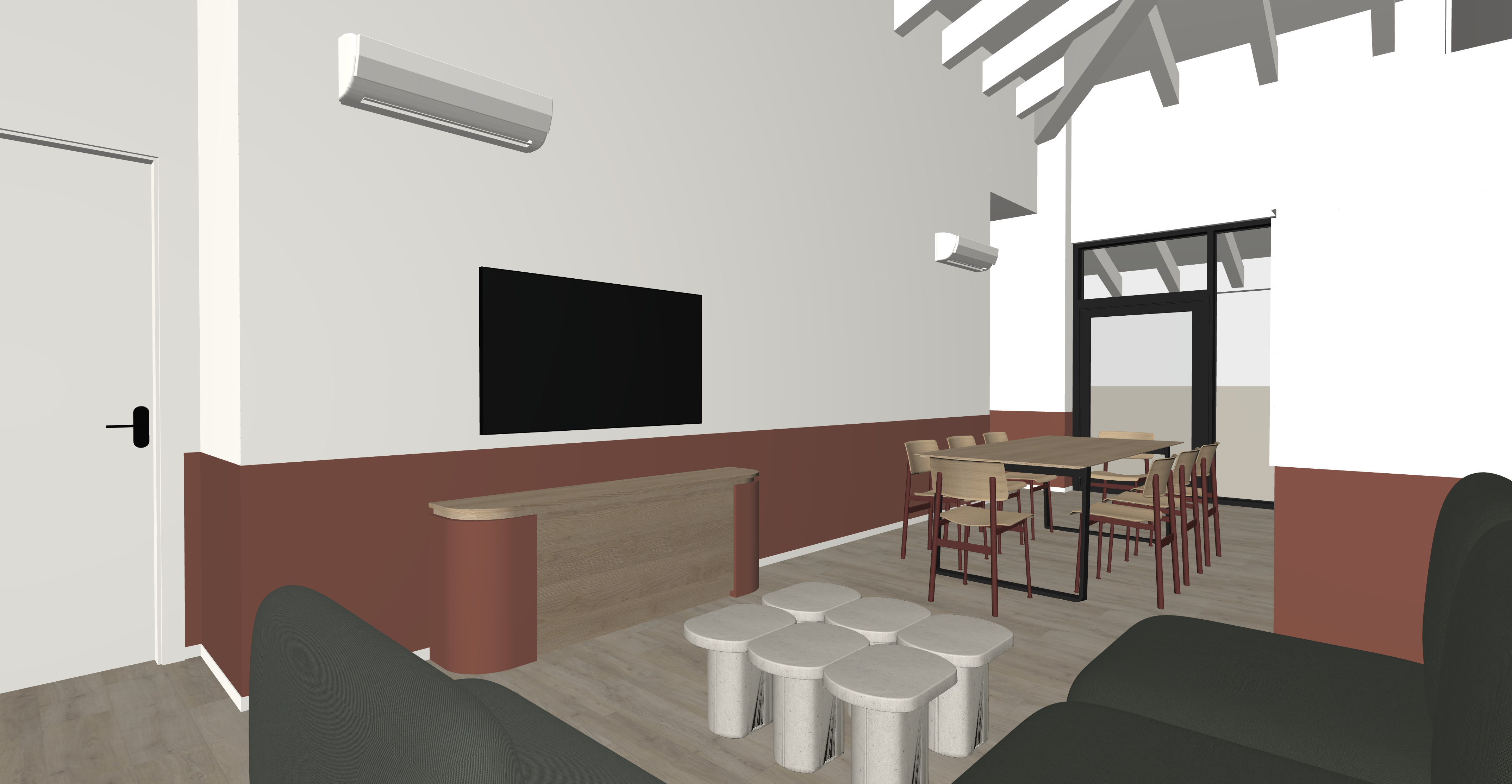 tessuto divano verde molto scuro nascondi sfondo esterno ma fai entrare luce naturale parquet in rovere chiaro senza nodi soffitto in legno sbiancato mantieni l arredo inalterato