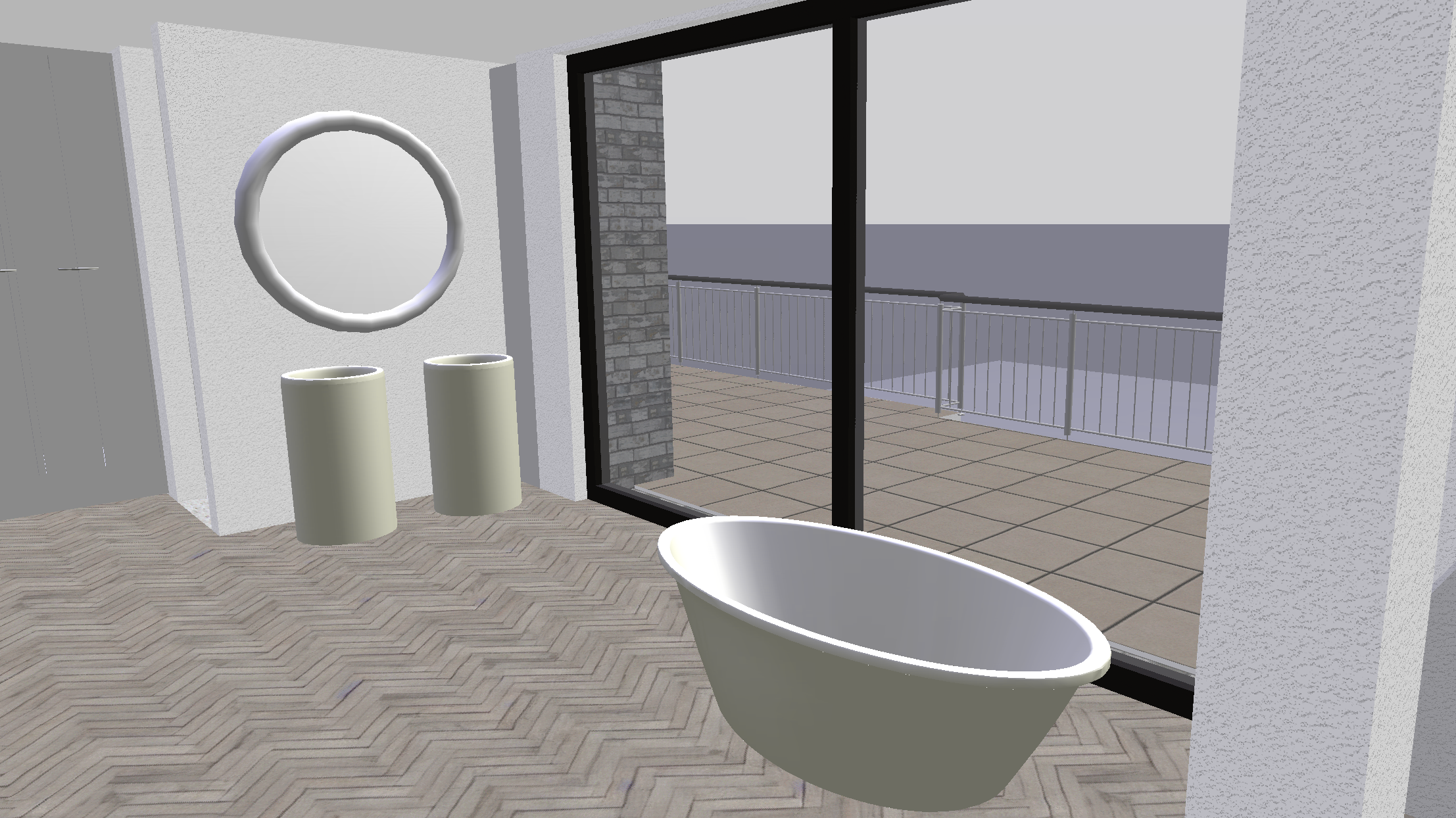 genau dieses rendering berarbeiten fotorealistisches innenraum foto exakt dieselbe perspektive und kameraposition wie das hochgeladene referenzbild 100 identische raumgeometrie exakt gleiche m belanordnung exakt gleiche verlegeart und richtung von parket wie vorlage exakt identische fensterpositionen mit gleichem ausblick durch die fenster weiches nat rliches tageslicht leicht schr g einfallende sonne durch die grossen fenster geschlossene r ume k nstlich ausleuchten sanfte realistische schatten blickrichtung ist nach osten sonnenlicht kommt von s den realistische materialien echte holztexturen stoff mit leichten gebrauchsspuren hochwertige oberfl chenreflexionen kleine gr npflanzen lavabo aus marmor collemandina grigio in braungrau dunkel dahinter je eine vola standarmatur fs2 edelstahl badewanne austauschen mit modell reflexlight von antonio lupi in klarglas braungrau dunkel mit standarmatur fs1 edelstahl auf fensterseite links hinten bei den lavabos hat es einen schrank f r badet cher schrankfronten alle grauglas gl nzend ohne griffe parket ruhig und hellgrau vollkommen rahmenloser und hinterleuchteter spiegel rechts hinter den lavabos ist die nicht sichtbare dusche hell ausgeleuchtet alle sichtbaren w nde sind sichtbeton graues badetuch l ssig ber badewanne werfen leichter tagesvorhang in graubeige auf der rechten seite des fensters runde filigrane schwarze einbauspots vor der fensterfront sehr moderner minimalistischer look nat rliche farbwiedergabe golden hour feeling das bild muss wie eine professionelle fotografie aussehen es soll ein echtes und reales foto sein canon eos r5 35 mm festbrennweite f 2 8 hyperrealistisch dslr qualit t raw aufnahme 8k aufl sung extrem scharf perfekte tiefensch rfe professionelle architekturfotografie