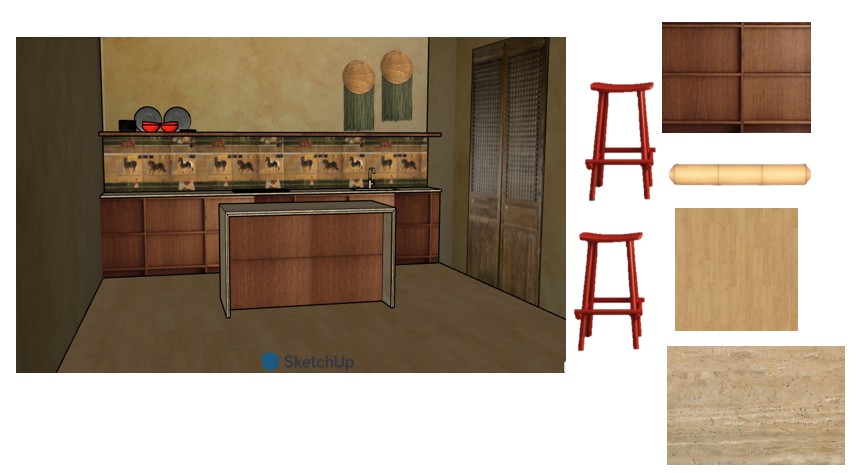 prompt archisync versione finale con lampada use the provided image as strict reference do not change layout geometry proportions camera angle or composition this is not a redesign this is only a material and realism refinement keep exactly same kitchen structure same island size and position same cabinetry same backsplash same shelf and objects same wall decorations same perspective do not add remove or move elements except where explicitly specified below materials only these floor light natural wood texture provided matte cabinetry island walnut wood texture provided countertops travertine texture provided matte faucet antique brass island keep same geometry and size slightly soften edges no redesign no openings no cut outs stools two red stools placed in front of the island aligned and parallel evenly spaced same design lamp new element strict rule add only one pendant lamp above the island horizontal cylindrical shape rice paper material soft diffused light suspended from ceiling with thin cables centered exactly above the island aligned with island length minimal no extra details do not change anything else in the scene when adding the lamp lighting warm soft diffused natural shadows no dramatic contrast style minimal clean realistic no reinterpretation