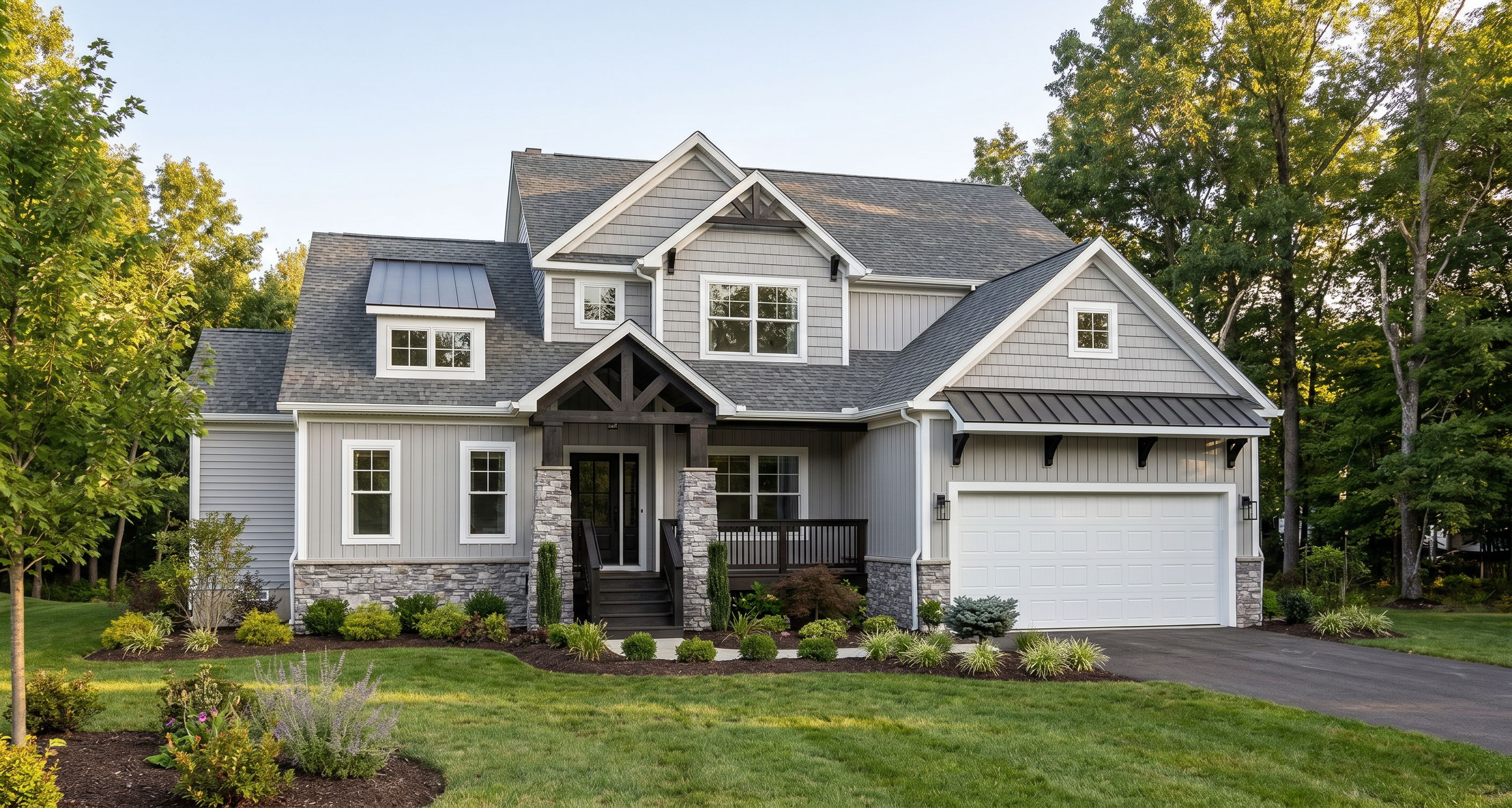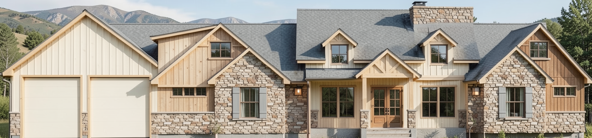 create a left elevation 3d rear rendering with all structural elements drawn untouched keep the angle as is apply the following selections a wolverine blue storm siding and timberline hdz charcoal black shingle roof veneer white windows white trim doors can be white or mahogany seed 10