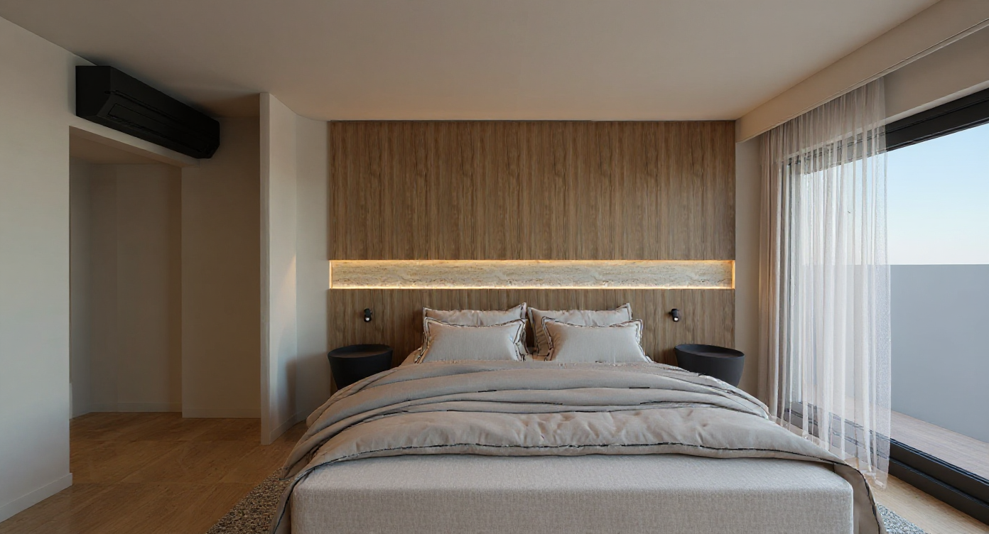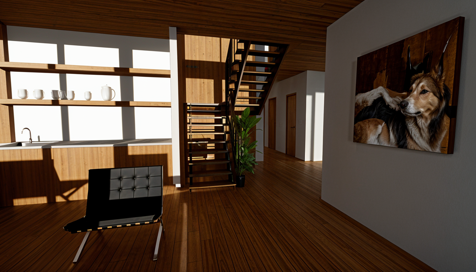 3pm evening a modern two story house with hip roofs featuring a dark gray panels with darker gray trim dark red brick surrounds the entry and garage doors the roof is a dark charcoal color large windows dominate the facade reflecting the clear blue sky the front and garage doors are dark cherry wood surrounding the house a lush green lawn with colorful flower beds in shades of pink lavender and yellow the atmosphere is serene and welcoming with evening sunlight casting gentle shadows do not modify the massing