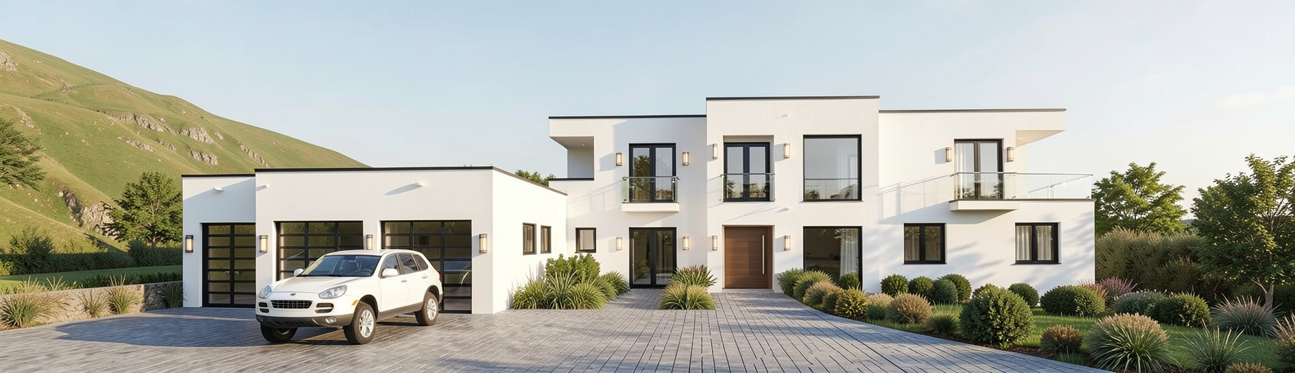 create 3d rendering with modern colors with simple landscaping with cedar shakes and board and batten siding