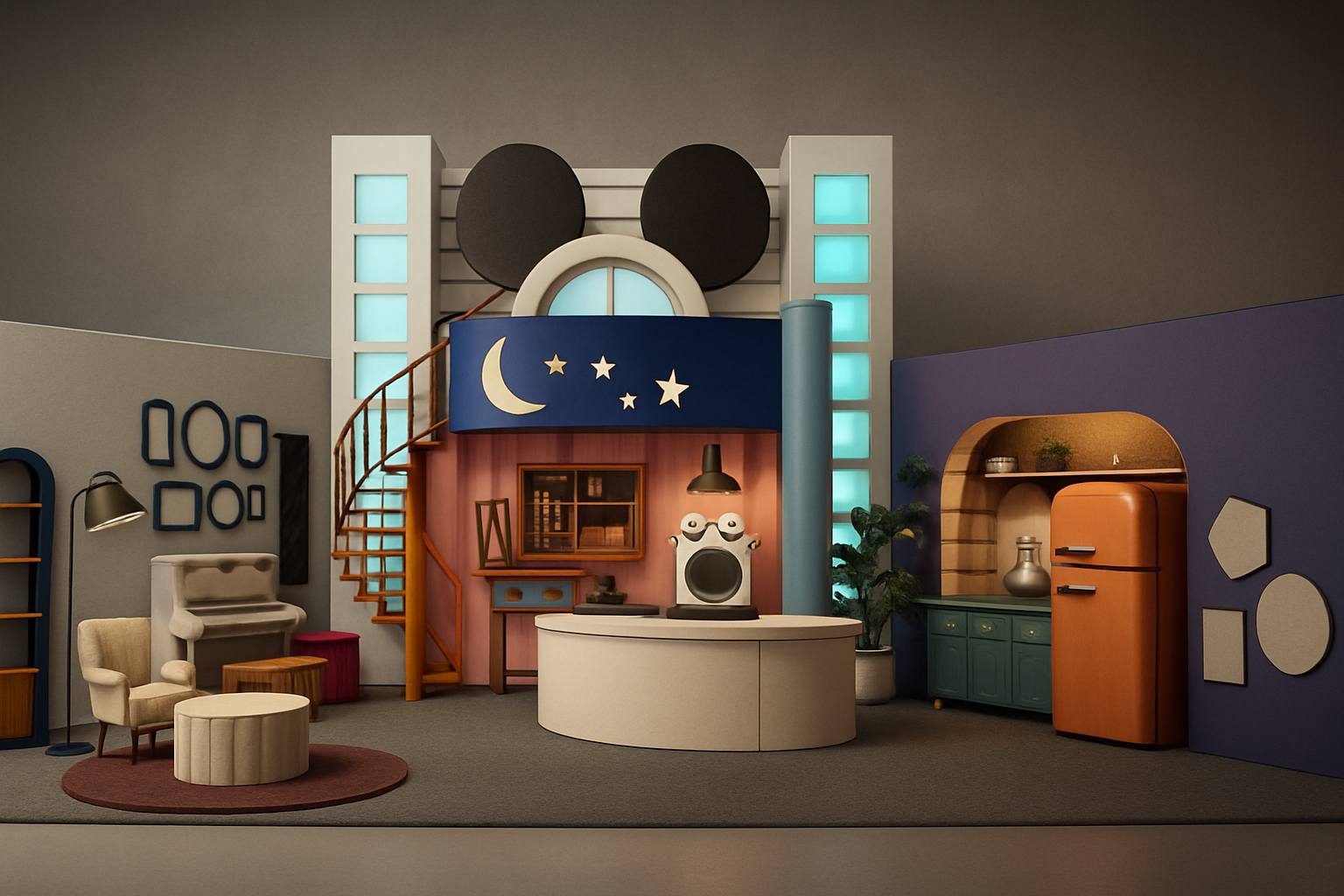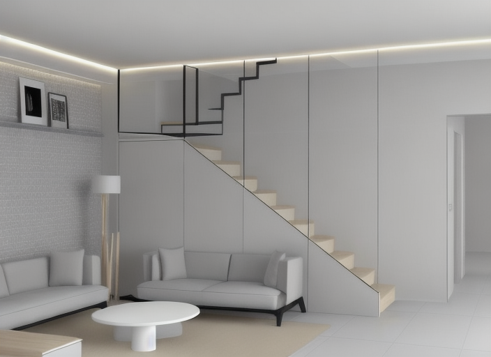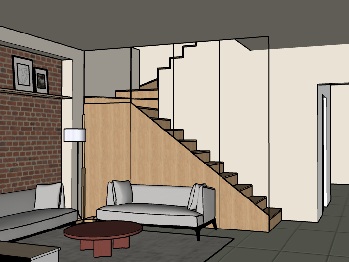 render a modern living room interior with a sleek staircase feature light oak wood for the staircase and wall panels use a soft warm white for the walls design the sofas in a light gray linen like fabric with black legs and arrange the sofa pillows in a natural relaxed way add a white rug under the seating area choose a cool gray for the floor tiles and incorporate a minimalist shelf with black frames on the wall set the ceiling to a warm white do not add any extra frames or shelves on the brick wall beyond what is shown in the picture the staircase must feature glass panels with a very thin anthracite gray frame lighting all natural light must come from the camera viewpoint direction no light should enter from the right side as there is a solid wall there use soft diffused frontal daylight with realistic global illumination add a subtle warm glow coming from the floor lamp without overpowering the scene style render in high end photorealistic quality with real world materials ignore all line art outlines and edge detection from the input image do not preserve any black contour lines or sketch like edges no sketch look no toon shading preserve the camera angle but ensure a fully realistic appearance