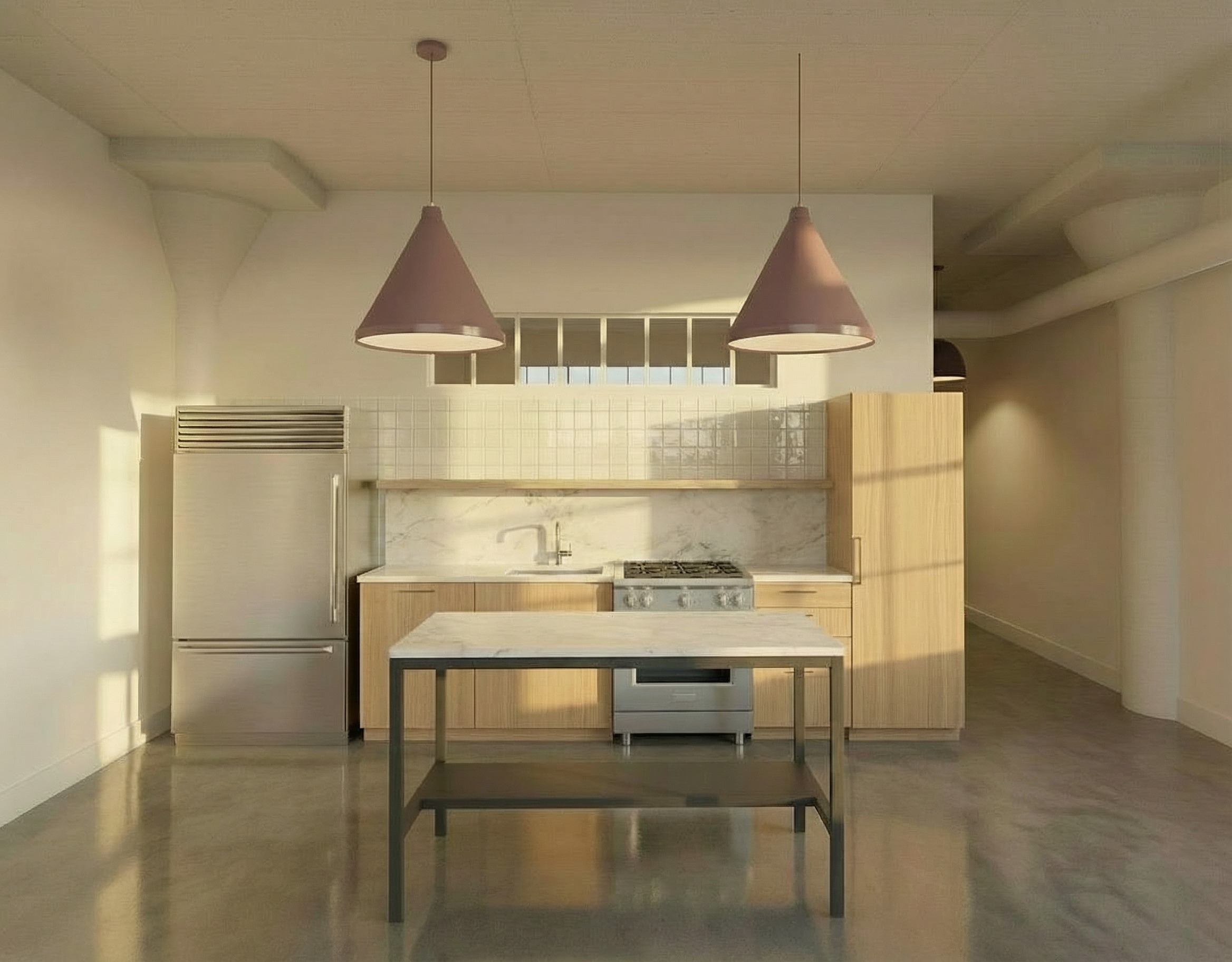 medium round bowl vase with white orchids and green moss on the island place three stacks of white ceramic dishware on the lower shelf of island do not change anything else do not change view do not add any other furniture do not add artwork