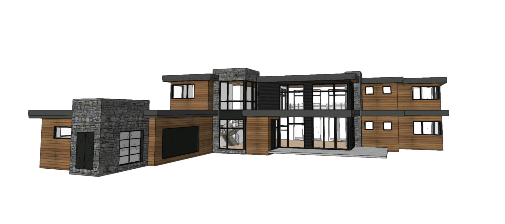 do not change any design elements or linework or formatting of image sizing enhance this rendering in a photorealistic way for this modern home sin the teton mountains of idaho use local scenery for the background add a driveway and path to front door add a range rover in the driveway add some light snow on the landscape and the house