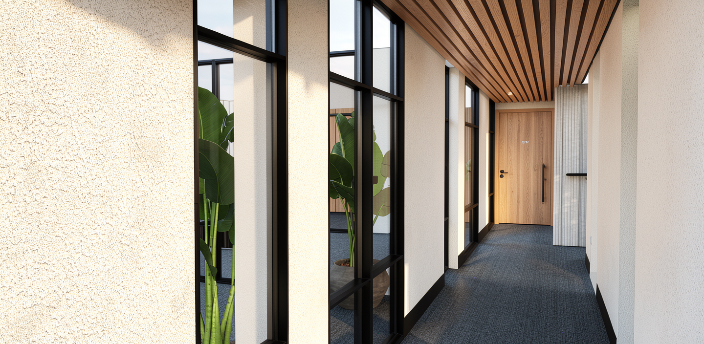make flooring mid grey plain office carpet add 2 led strips to ceiling between timber battens remove long handle from door at end