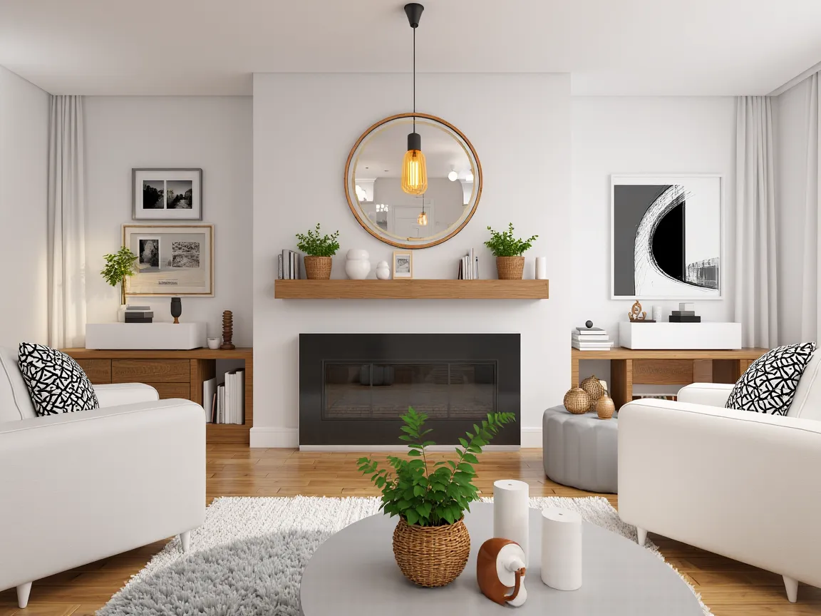 this image depicts a modern and cozy corner of a room with a stylish minimalist design the room features a teal armchair with wooden legs placed next to a large window covered by a bamboo style blind a small plant sits on the windowsill adding a touch of greenery to the right there is a blue accent wall with a large circular shape in a contrasting tone giving the space a vibrant yet serene feel below the accent wall a shelf holds books a decorative fish tank and a variety of small plants the floor is covered with a black and white cowhide rug which adds texture and character to the space a large black and white portrait of a woman wearing a hat adorns the wall and next to the shelf a tall indoor plant adds more natural elements a small decorative cat figure is placed on the floor near the rug enhancing the playful atmosphere of the room the overall vibe is calming and sophisticated with a mix of nature and contemporary design elements architecture