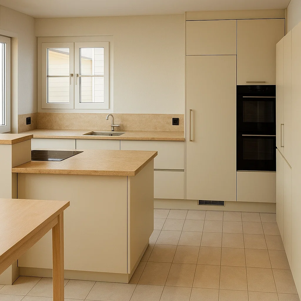 modernist wide angle shot modern minimalist kitchen with soft lighting featuring cream colored cabinets and countertops include a sleek stainless steel faucet and two black built in ovens the walls are a warm cream with large white framed windows allowing sunlight to fill the room the floor is tiled in light stone gray add subtle natural shadows for depth and a clean inviting atmosphere architecture