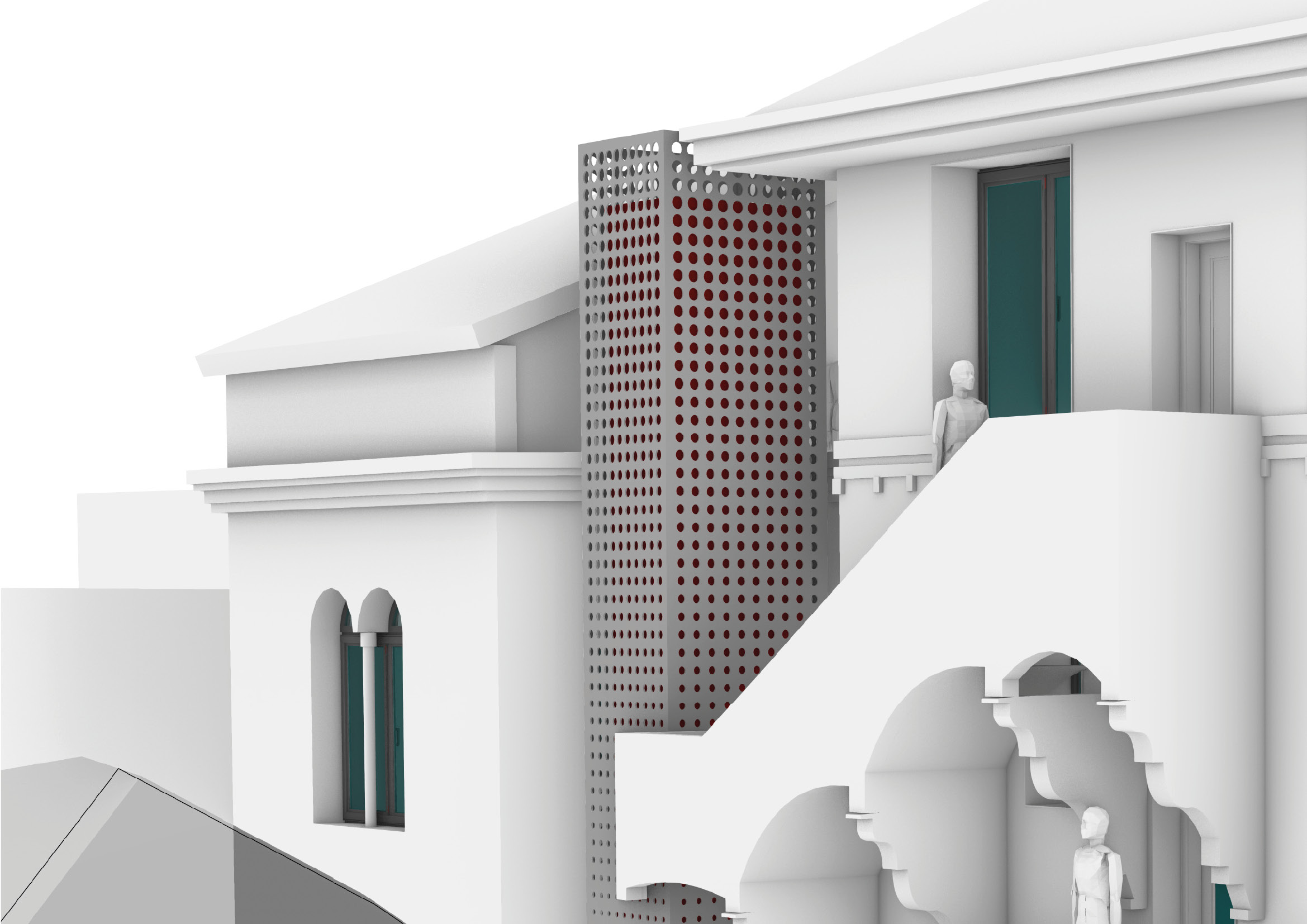 an old buildin made of red old bricks and white details with a futuristic elevator made of dark steel panels perforated
