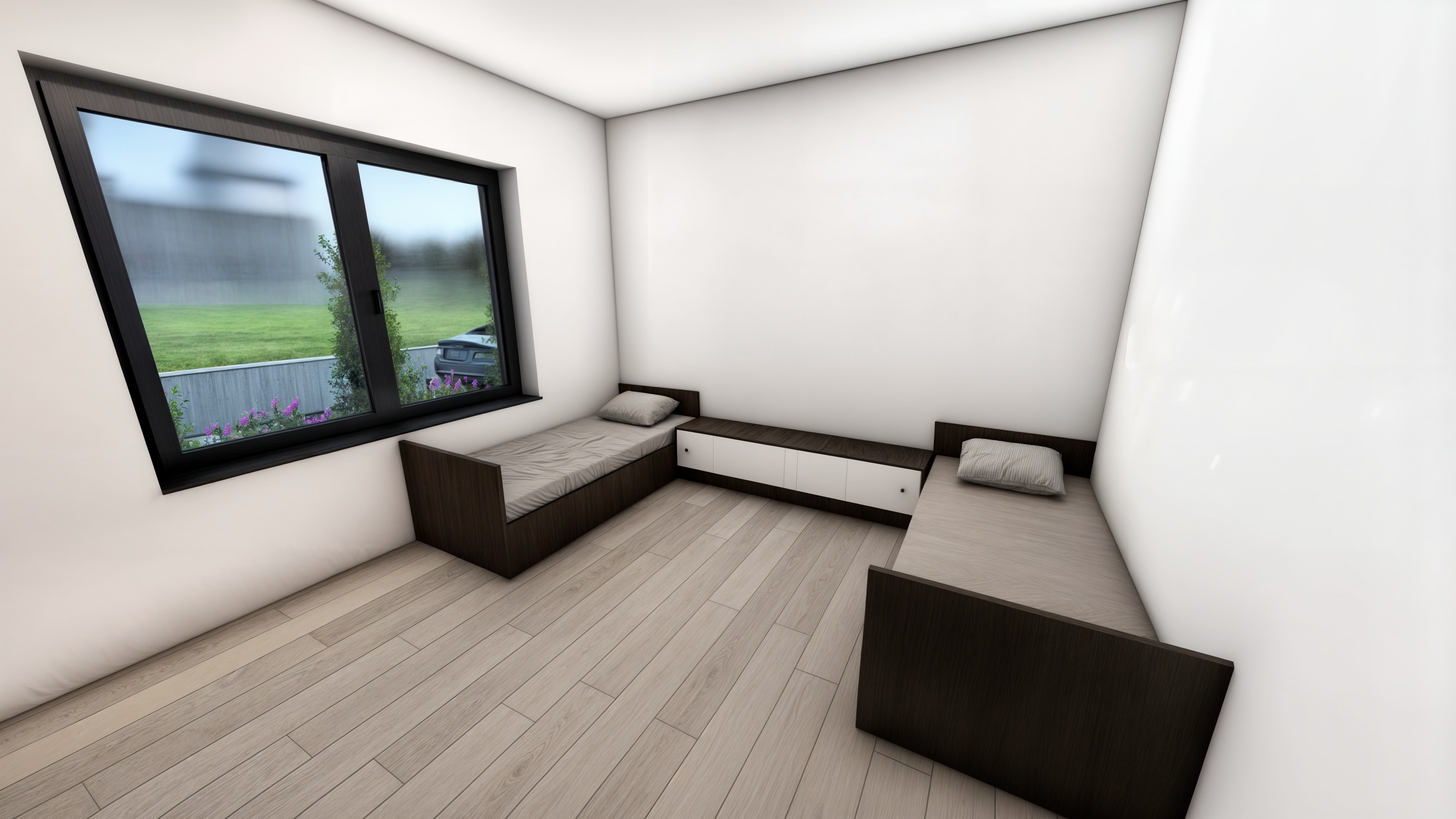 ultra realistic modern bedroom interior keep existing beds unchanged upgraded interior styling warm natural daylight soft ambient lighting cozy and inviting atmosphere refined contemporary design elegant materials decorative elements subtle textiles soft shadows realistic fabric textures balanced composition high end interior design photorealistic preserve layout and furniture placement while enhancing aesthetics don t change the view out of the window
