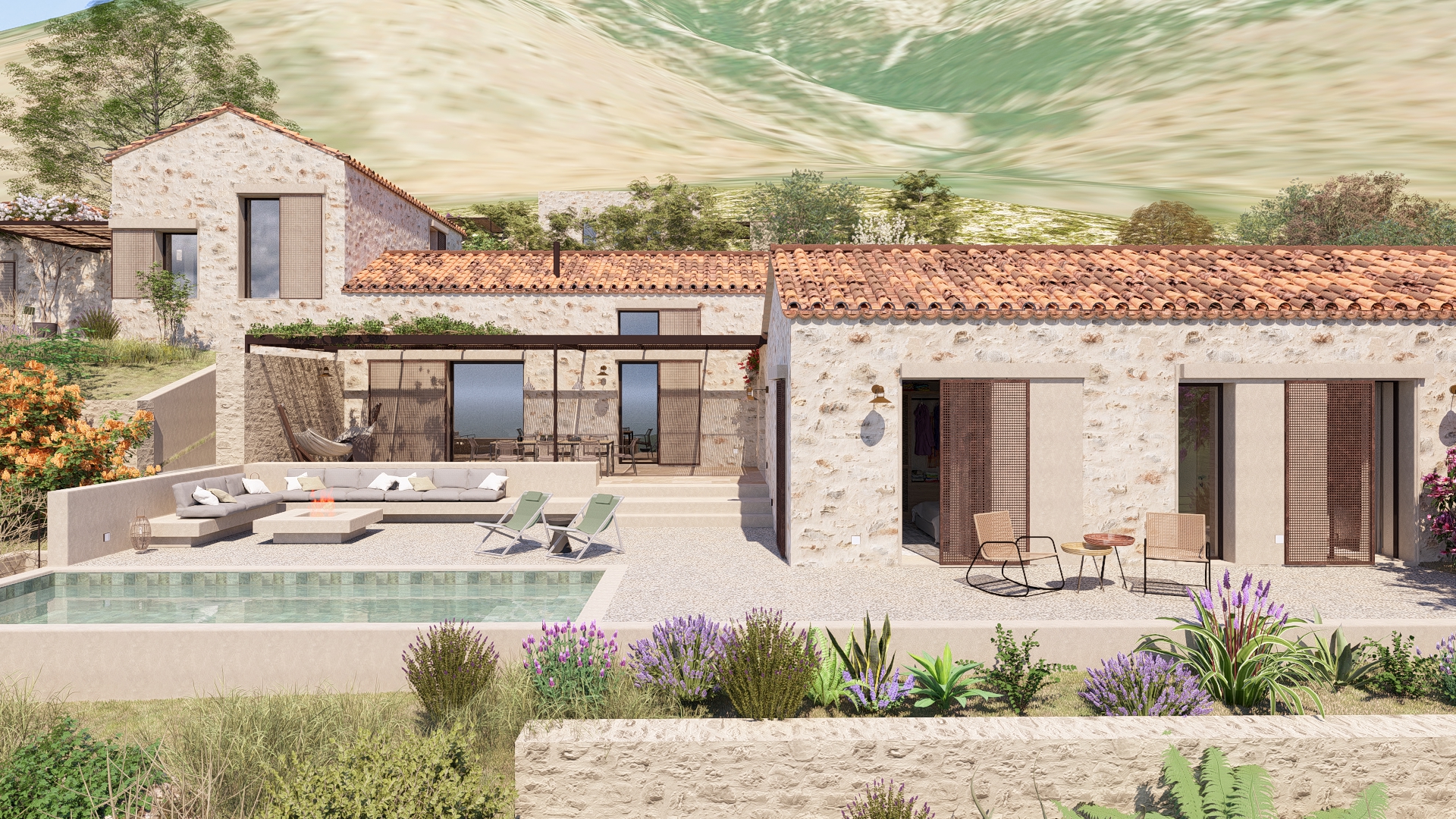 more realistic result do not change the materials of the stone walls floors roofs windows shutters make the sun facing the buildings but a little frome the left and not to strong light