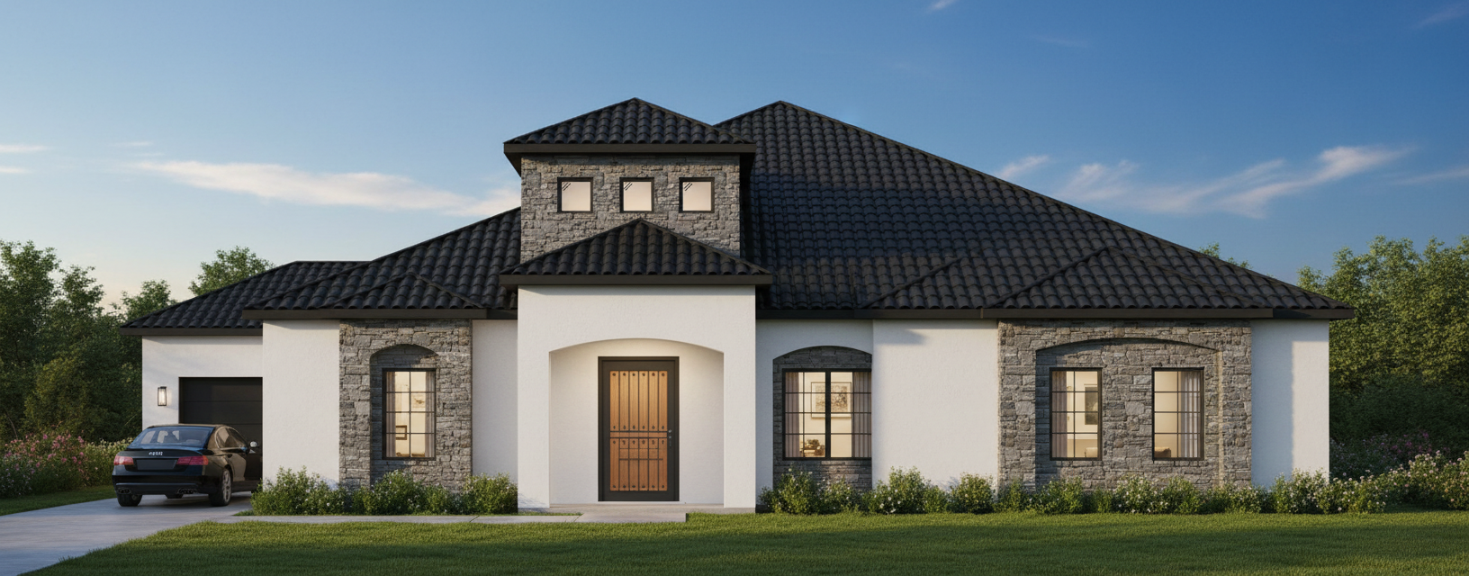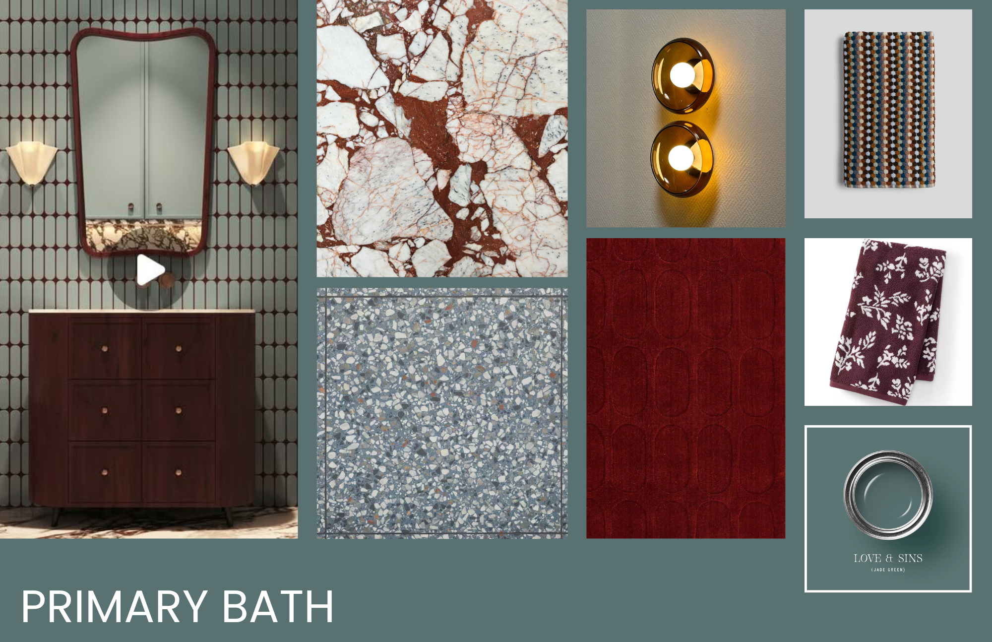 render a high end designer 1970s modern bathroom from the moodboard featuring a slab of michelagelo quartzite as the countertop and shower walls show any light fixtures as illuminated and add warm sunlight from nearby windows ensure there are several plants around the space and a companion wallpaper feature behind the vanity