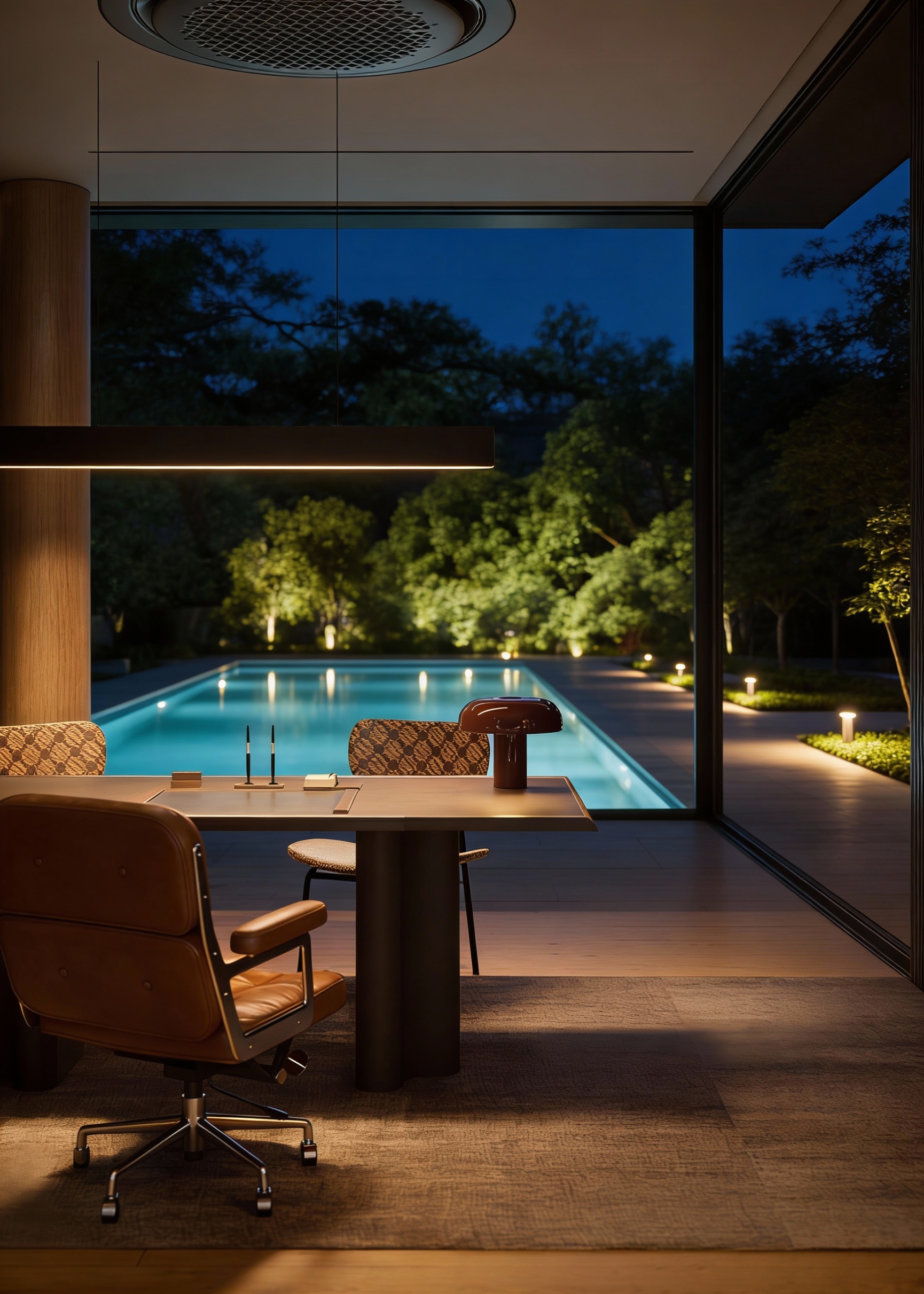 enhance the realistic texture and night lighting set indirect artificial lighting for the outdoor area and interior maintain the elements material and angle of the picture set the lighting become intimate
