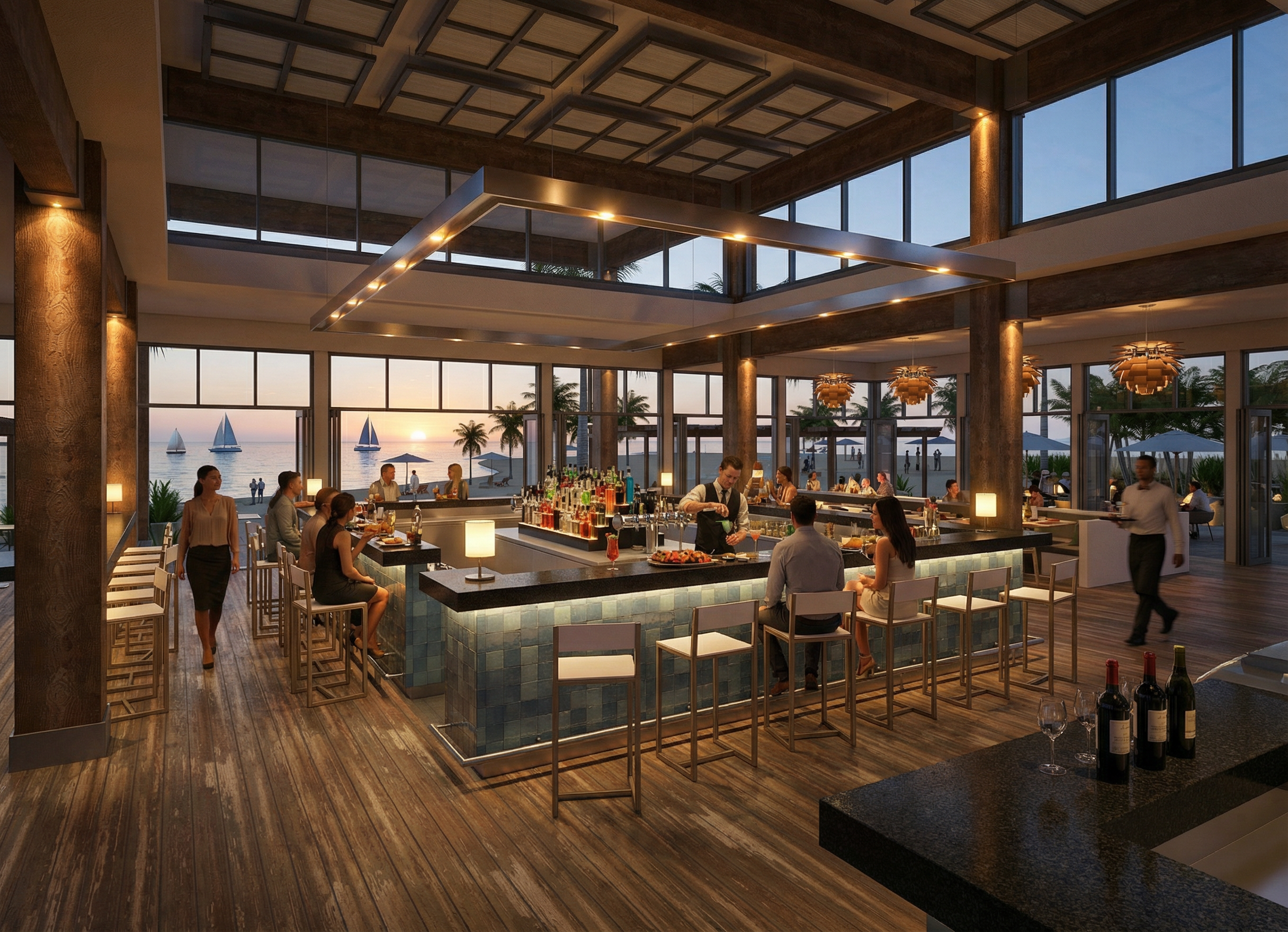 evening view location is a beach resort on the red sea egypt the views beyond the building are of the horizon over the water add low level lighting effects to the inside of the restaurant add people sitting the restaurant at the tables and stools add drinks and food to the tables and bars add seafood on a bed of ice in the display cooler add a chef cooking at the circular grill light up the wine bottles in the glass display cases the columns and beams are made of heavy wood timber add up lighting the the ceiling add people sitting at the bar on the stools by the wine display cases keep the perspective view in the source image add three sailboats on the sea near the horizon keep the decorative screens in the foreground at the left and right side of the original view keep the lighting from the last rendering add a wine sommelier by the wine display cases make the square suspended lighting over the bars stainless steel material add a couple looking into the display case add a waiter carry a tray of seafood entrees on the left side of the view add some steam rising from the grill where the chef is cooking