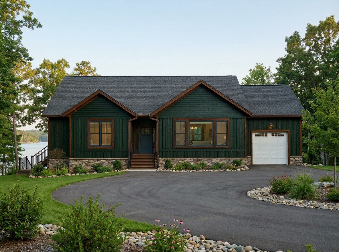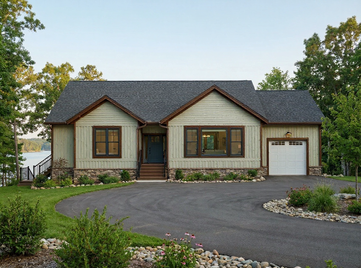a modern ranch style structure with the following features 1 medium gray asphalt shingles 2 40 high river rock wainscot all along the front base of the house 3 the large window openings are a pair of white single hung windows with divided light top and bottom windows 4 black shutters on the sides of each window 5 white vertical board batten siding from the top of the stone up to the roof overhang 6 the glazing to the right side of the garage is a pair of 36 wide white arcadia patio doors with divided lights 7 there will be a 3 high river rock courtyard wall extending 16 to the right side of the garage 8 the sectional garage doors will be black with a 3 long x 6 window on the right end of each panel 9 the existing chimney will have river rock that matches the house wainscot no other options allowed stay specifically with my instructions