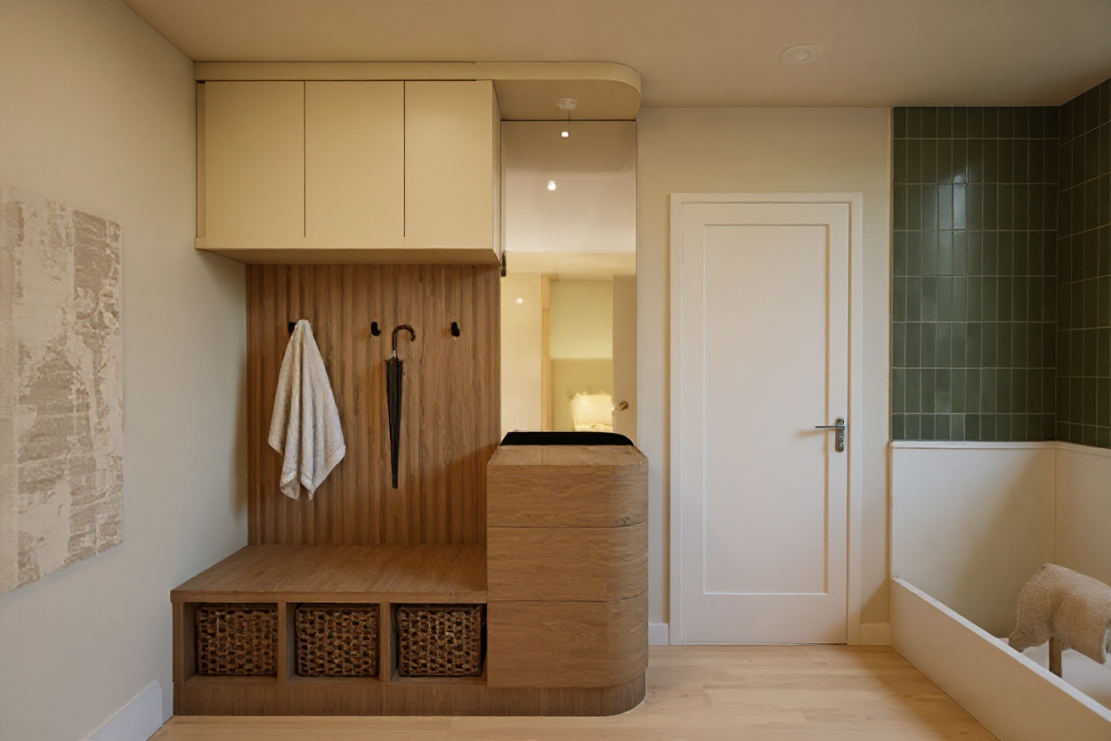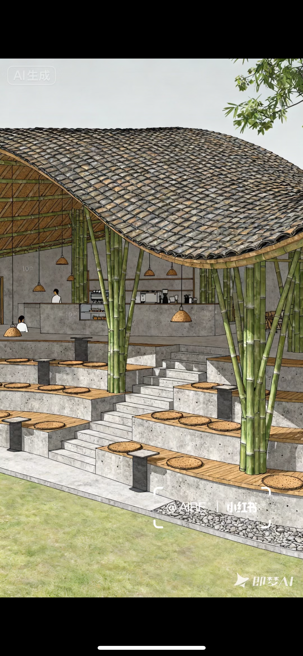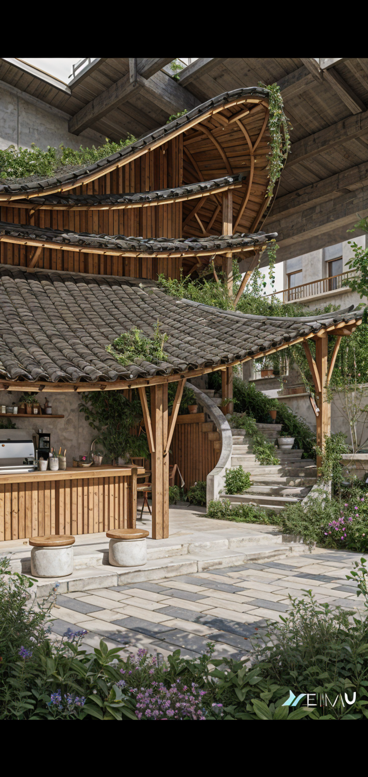 bobby mcalpine interior shot render this to make it seem more realistic keep the materials as wooden and nature style make the roof very abstract looking with a chinese traditional architectural style add more open space area and void add more greenery architecture