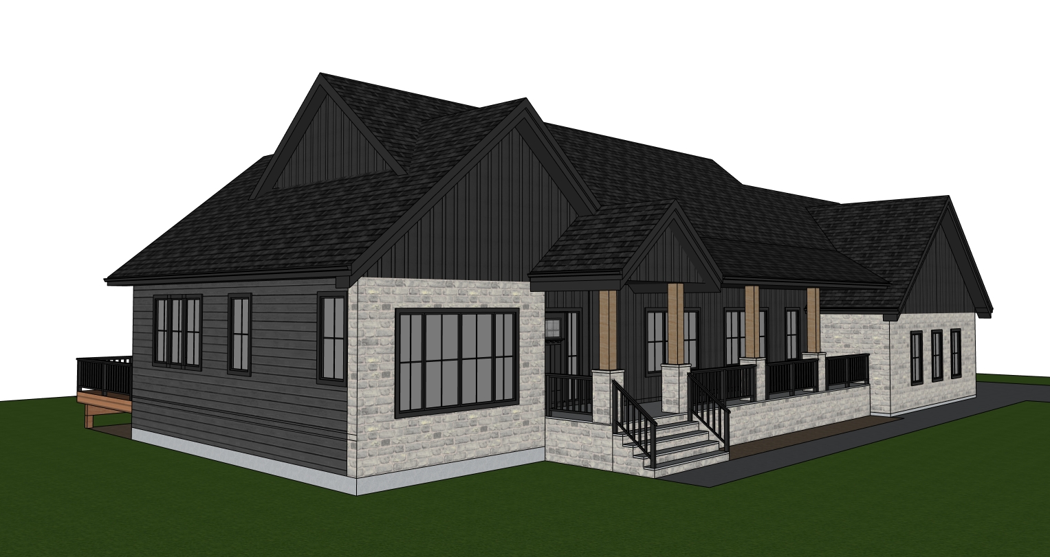 keep all colours and materials the same as source image add very few short shrubs and flowers in front of porch add some elm and oak trees in the background