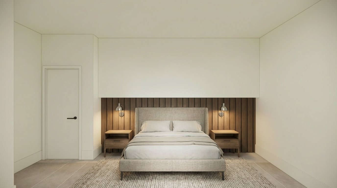 photorealistic enhancement of the provided architectural render preserve the exact architecture layout materials furniture placement and fixtures from the original image with no redesign or modifications the purpose is only to improve realism and lighting quality render as high end interior photography using a full frame camera with a 24 35mm architectural lens balanced exposure realistic dynamic range subtle depth of field and natural color grading the image should look like a professionally photographed luxury interior rather than a computer render soft natural daylight diffused window light global illumination balanced exposuredo not change architecture do not change materials no redesign no new objects no additional lights no glowing fixtures no light from shower heads or faucets no dramatic shadows no surreal lighting no warped geometry no stylization please include modern furniture in this guest bedroom it should include one bed with headboard two night stands and an area rug the lighting should be even without shadows