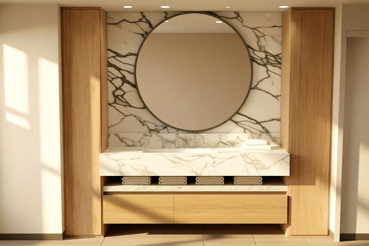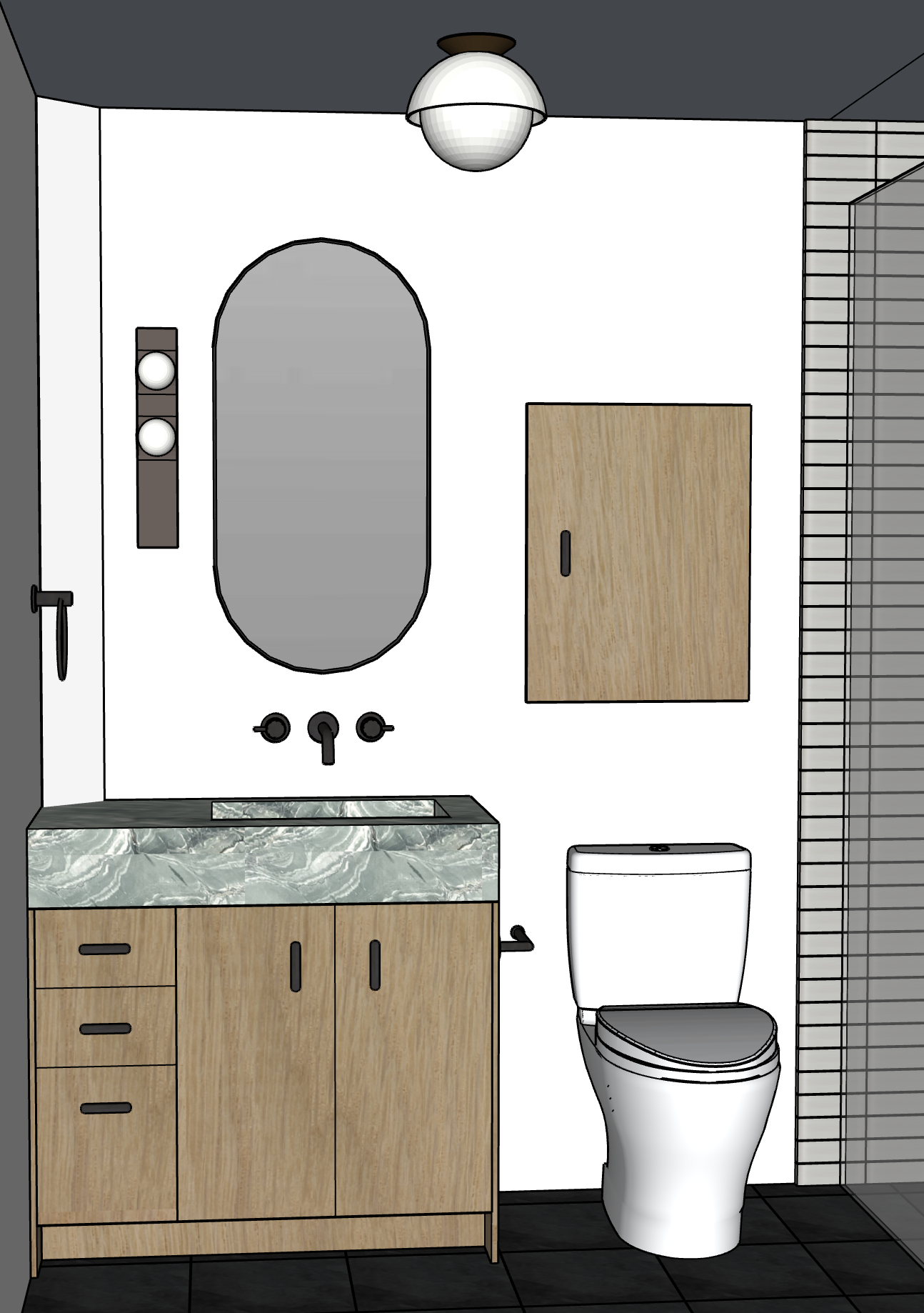 the atmosphere is warm and inviting the bath fixtures are matte black finish the walls are white the floor is dark grey slate tiles the tiles in the shower are rectangular matte light beige ceramic tiles the sconce by the mirror is a aged brass finish with two round bulbs