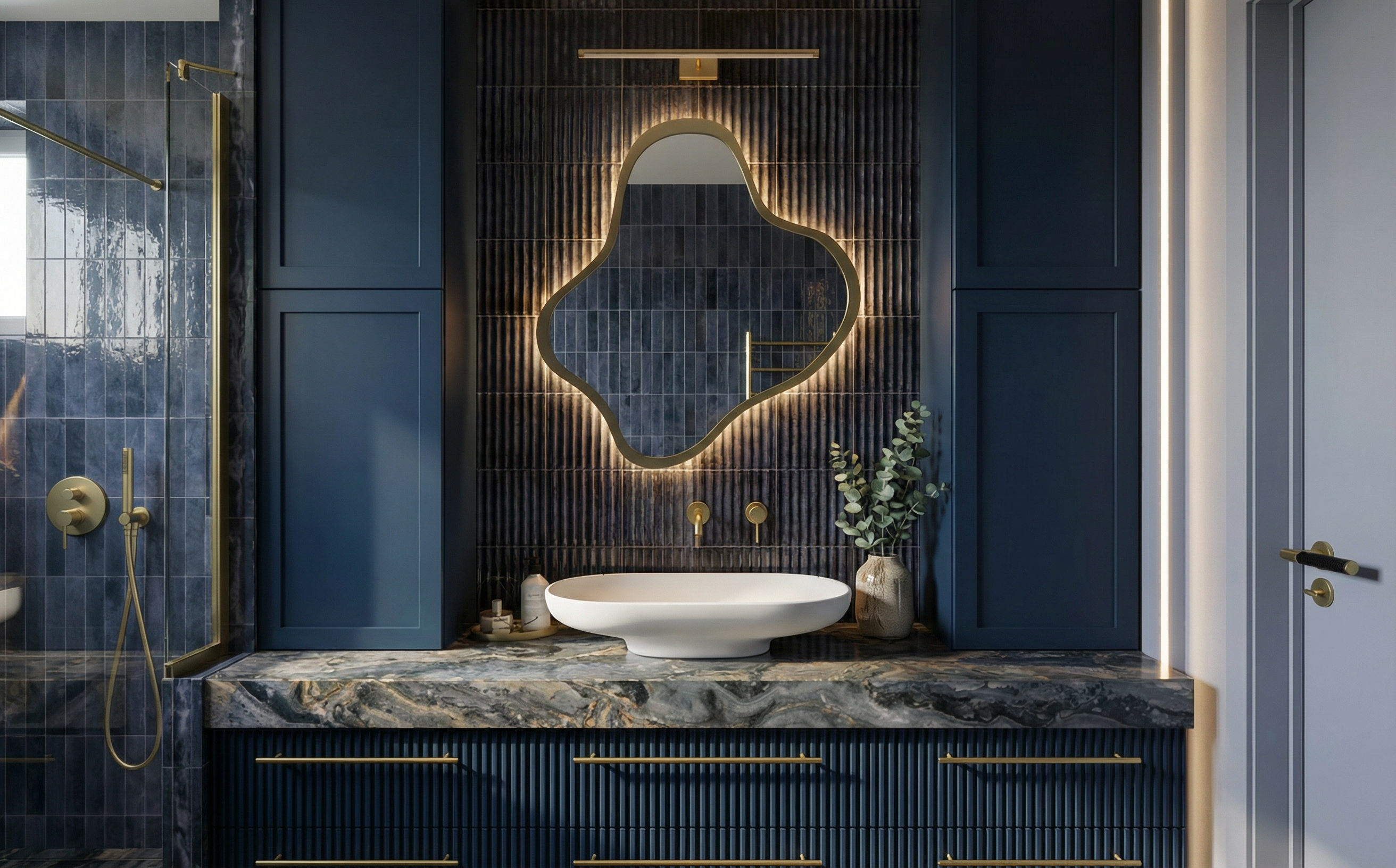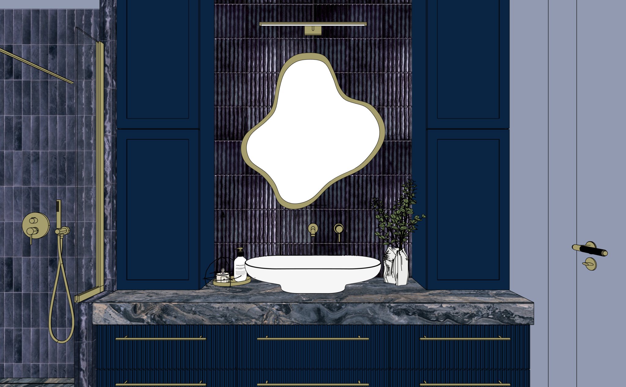nie zmieniaj geometrii perspektywy tekstur mebli kolor w lustro jest pod wietlane od ty u kinkiet jest wy czony szafki s lakierowane matowym lakierem umywalka jest bia a matowa popraw wizualizacj eby by a hiperrealistyczna