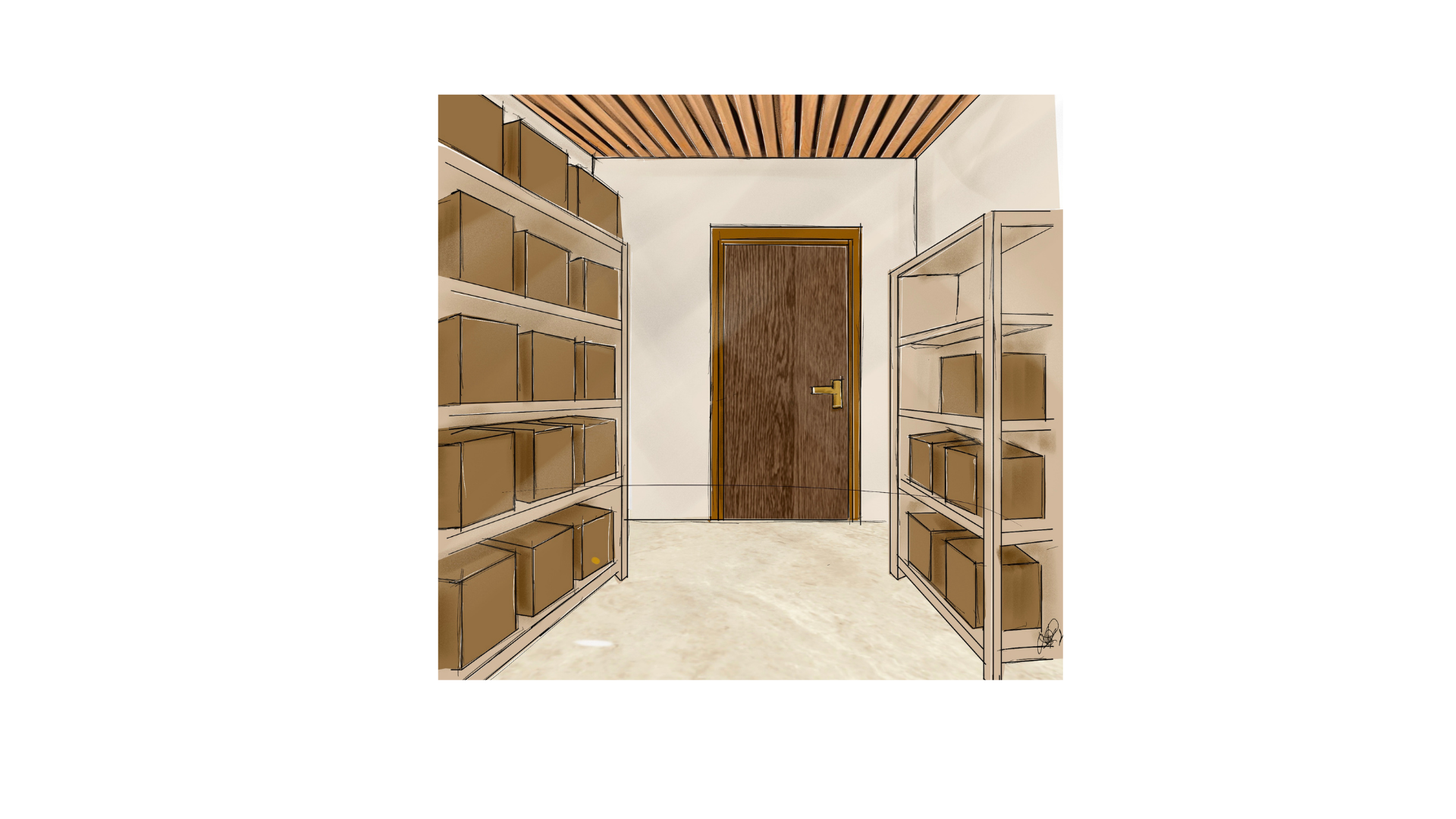 a cozy and well organized storage room with a warm welcoming atmosphere wooden shelves on both sides filled with neatly arranged brown cardboard boxes a wooden door with a golden handle at the end of the room complementing the natural wooden ceiling walls are painted in a soft cream color and the floor is a light beige tile soft ambient lighting enhances the earthy tones creating a sense of calm and orderliness in the space