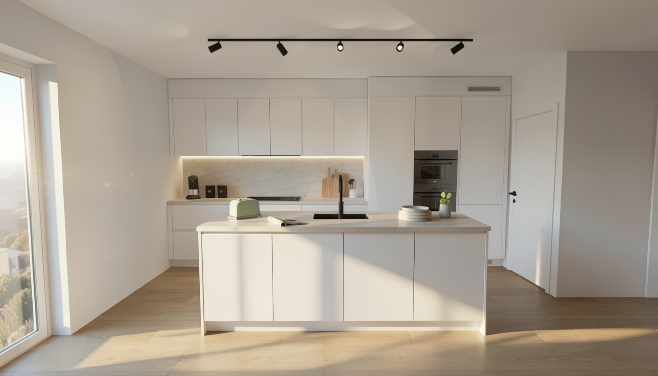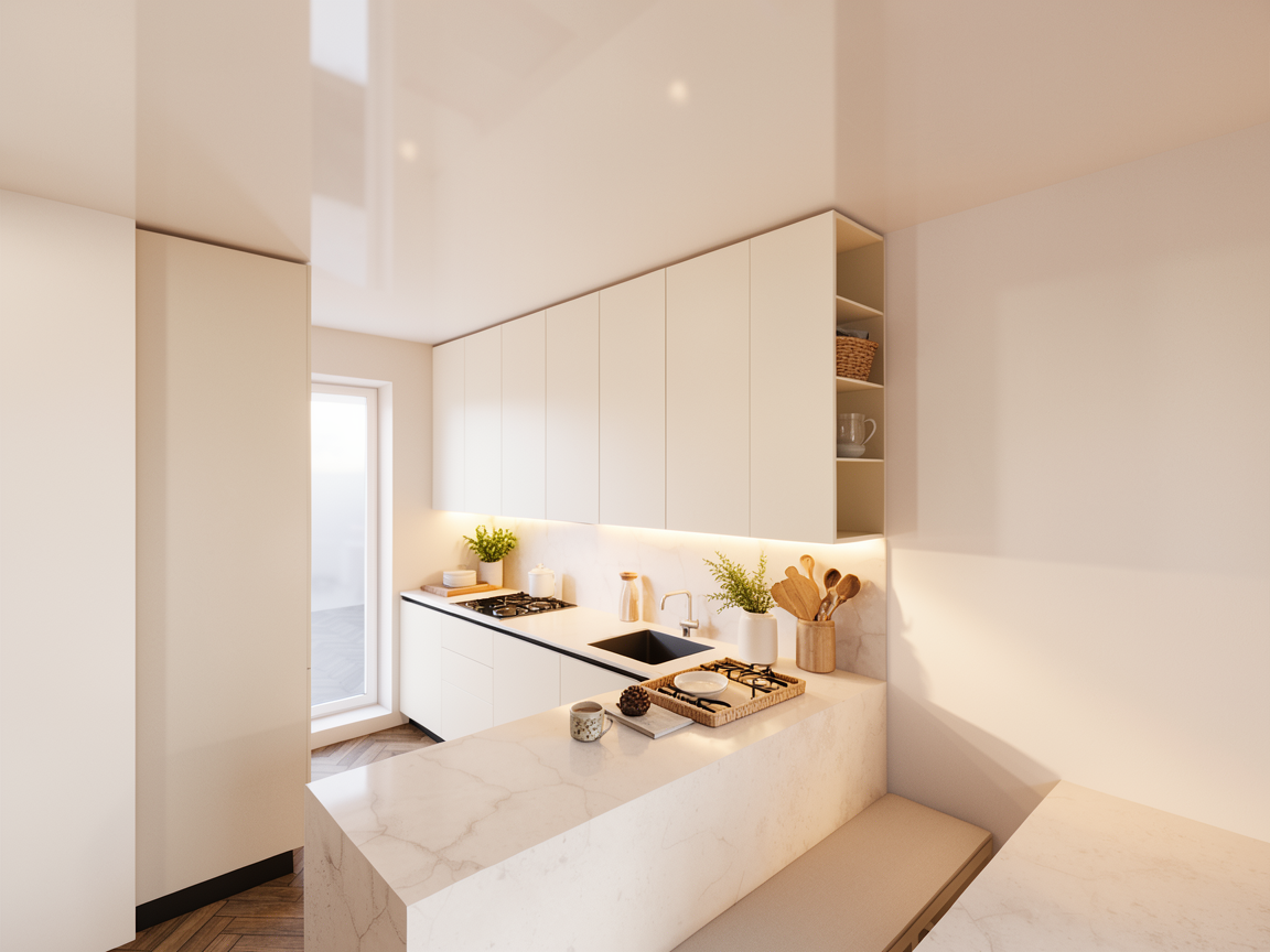 prompt dla archsynth maintain colors precision hyperrealistic interior kitchen render convert the attached kitchen design screenshot into a photorealistic architectural visualization maintain exact layout proportions and placement of every element from the input image strict layout rules do not add remove or reposition any element every cabinet appliance vent grille outlet and shelf must stay exactly where it is in the input preserve electrolux built in oven left tall cabinet induction hob countertop left side dark tall faucet with sink right side of countertop two wall outlets above countertop narrow open shelves between upper cabinets hood extractor above open shelves vent grilles bottom and top of right tall cabinet top of left tall cabinet no decorations plants dishes food or accessories the kitchen must be empty exactly as in the design colors reproduce exactly from the input image look carefully at the input image there are two different colors on the cabinets you must reproduce them exactly as they appear in the source image the upper wall cabinets in the input image are a lighter almost white cream color the lower base cabinets and tall columns in the input image are a darker warmer beige cashmere color do not unify these colors do not average them copy each surface color directly from the corresponding area of the input image the color difference between upper and lower cabinets is intentional and must be preserved exactly as shown in the source the backsplash and countertop are grey stone with warm veining copy this color and texture directly from the input image as well walls white as shown in input floor light grey concrete tiles as shown in input render settings camera angle identical to input corner view slightly from the left lighting soft natural daylight even illumination that preserves the original color differences from the input do not wash out or flatten the color contrast between upper and lower cabinets quality photorealistic architectural interior render 4k resolution style clean minimalist modern scandinavian surface realism subtle reflections on marble countertop matte cabinet fronts realistic concrete tile texture on floor no vignette no dramatic color grading neutral true to life color rendition