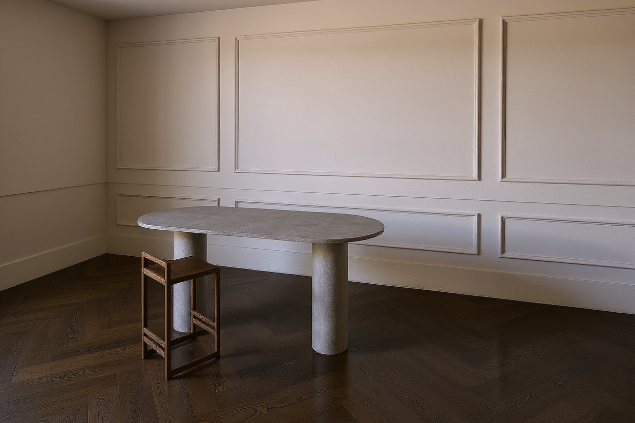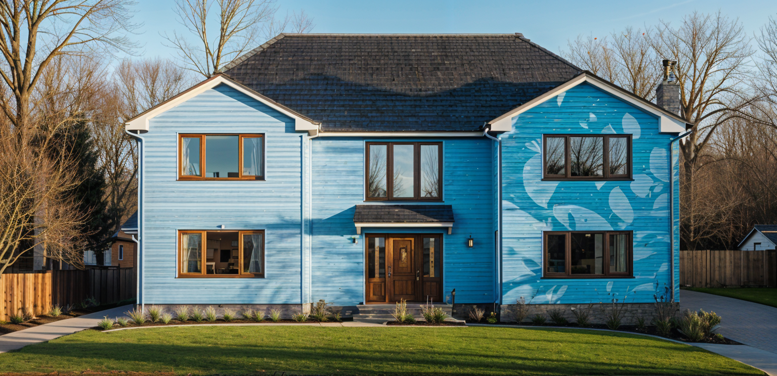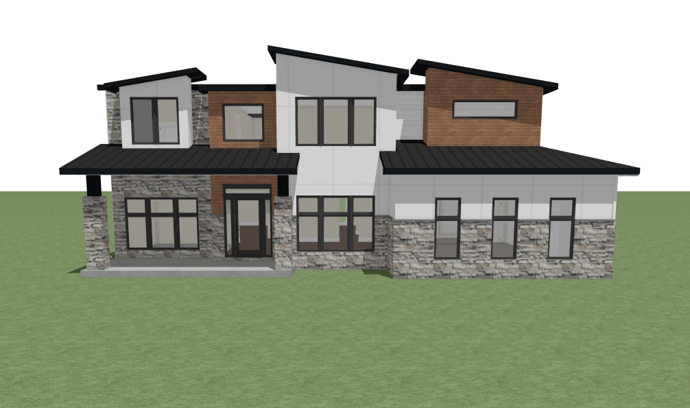 render this 3d image to appear photo realistic maintain all existing architectural materials and structural elements exactly as shown enhance the setting with a lush well maintained landscape include minimal beds manicured shrubs and a tree lined backdrop that frames the home naturally the windows should have a glossy finish with clear reflections of the surrounding trees and sky lighting should feel natural with soft shadows and realistic depth to bring the scene to life