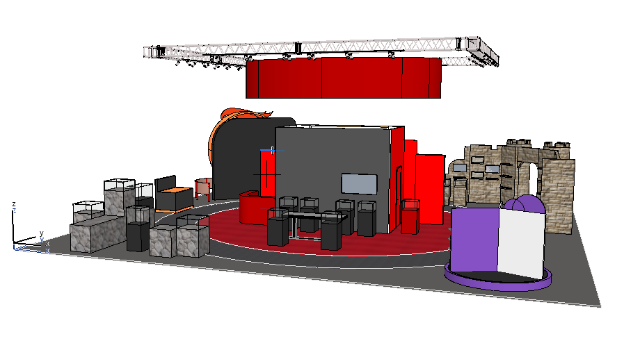 trade fair exhibition hall large industrial pavilion with high ceiling overhead truss lighting system led spotlights busy fair atmosphere with visitors in background other stands visible in distance concrete floor with booth carpet realistic photography style natural and artificial mixed lighting sharp details photorealistic render 35mm lens depth of field