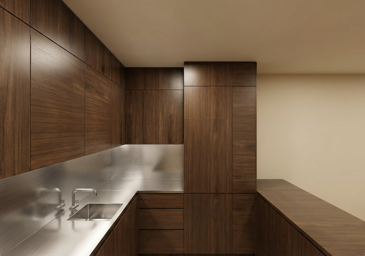 photorealistic architectural interior exterior render of a boutique retail space with a bar located on the right hand side only the bar is minimal and refined designed for intimate cocktail classes on the bar surface include a very limited and curated setup approximately 6 elegant cocktail glasses one bottle of grey goose vodka and a small selection of premium spirits the arrangement should feel intentional sparse and gallery like rather than busy the overall atmosphere is moody and dark with low ambient lighting use soft warm directional lighting to highlight materials and create contrast with deep shadows and a cinematic tone include one human figure near the bar for scale standing naturally not posing and an additional subtle scale reference such as a stool or bench the human figure should be proportionate and realistic ensure accurate proportions bar fridge height 900mm floor to ceiling height 4300mm maintain realistic architectural scaling throughout the space materials should be highly realistic dark finishes matte surfaces subtle reflections and rich textures the space should feel exclusive curated and slightly mysterious style high end architectural visualization cinematic minimal moody luxury camera eye level slight angle not flat