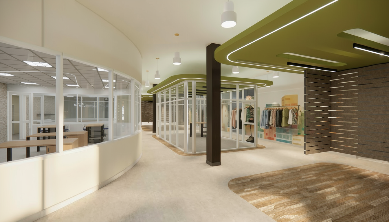 add a small retail vignette under the green ceiling cloud to the right of the image do not change any design elements of the original image
