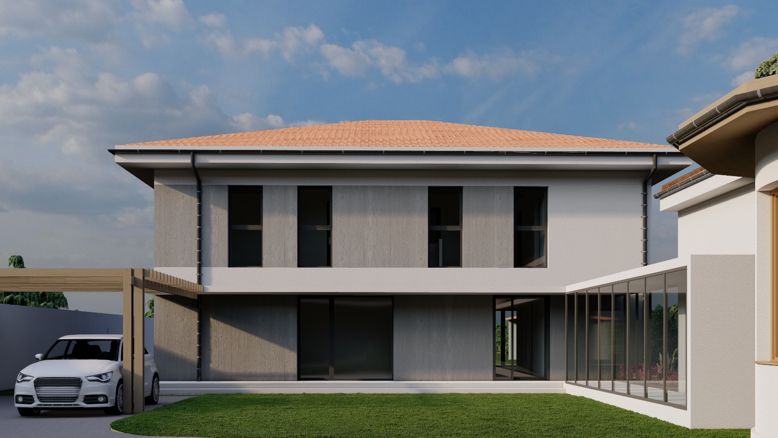 minimalism exterior shot stucco fassade more vegetation beautyful clouds enhanced car tall trees in the bckground woman with a kid in the front door hyper realistic render architecture